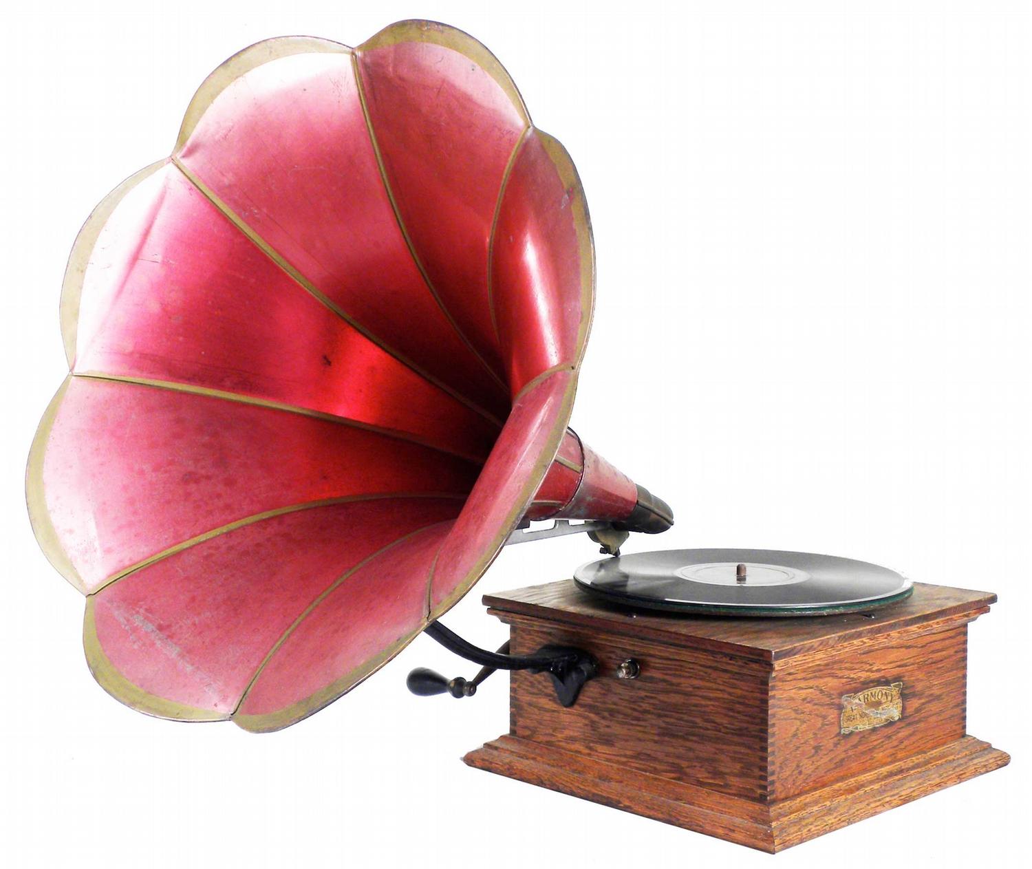 Early Columbia "Harmony" Phonograph, 1911. Great Northern Mfg Co. Chicago. Decorative perforations in the front panel to allow the sound to escape. Table top model with original oak cabinet and original red horn. Excellent original working condition. Horn measures 17 inches.