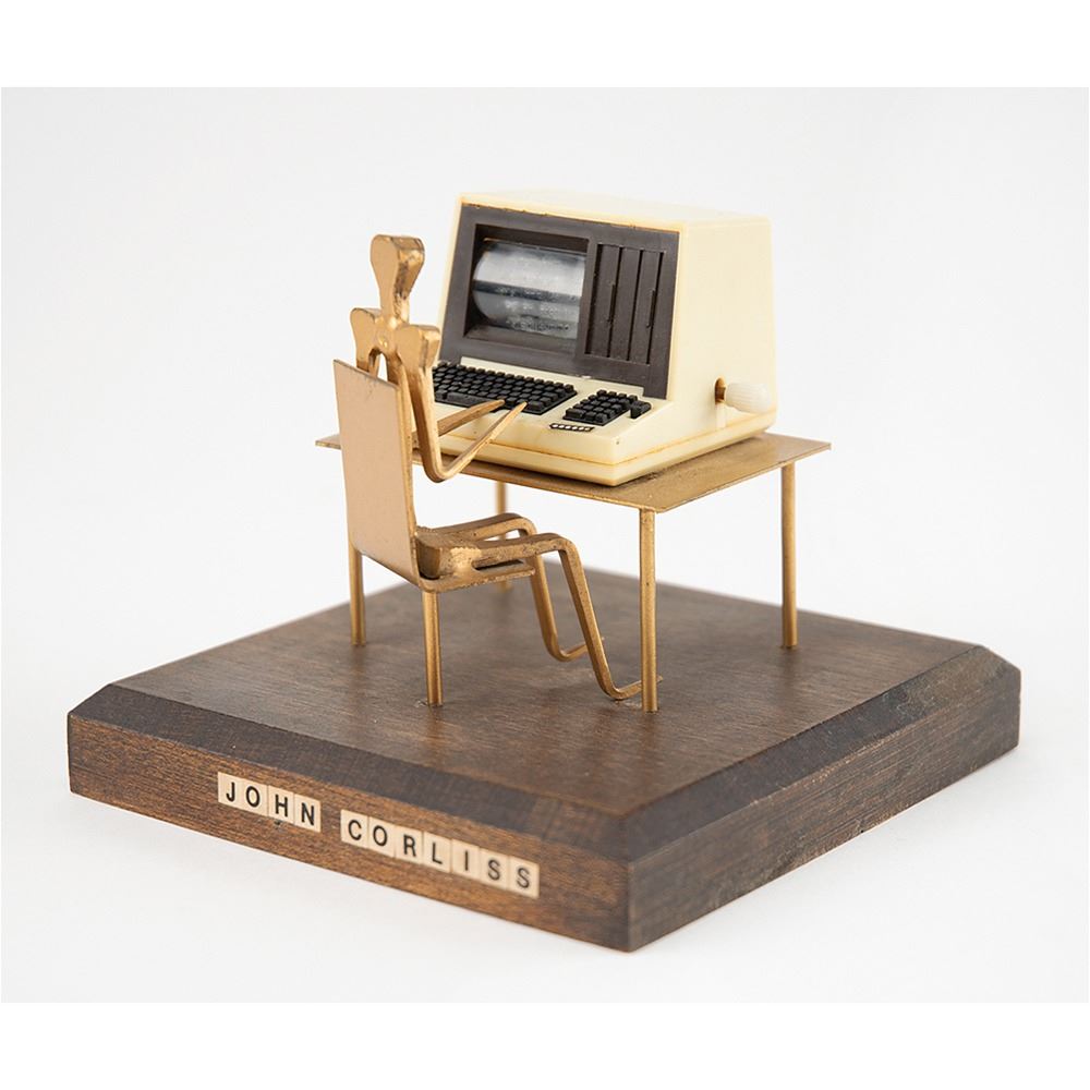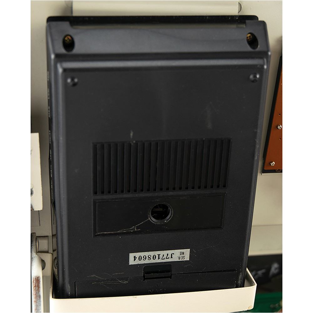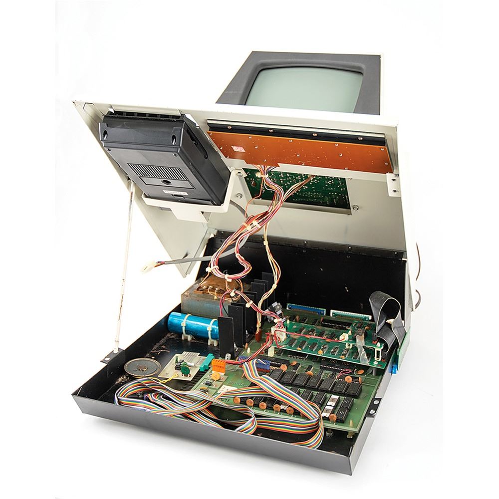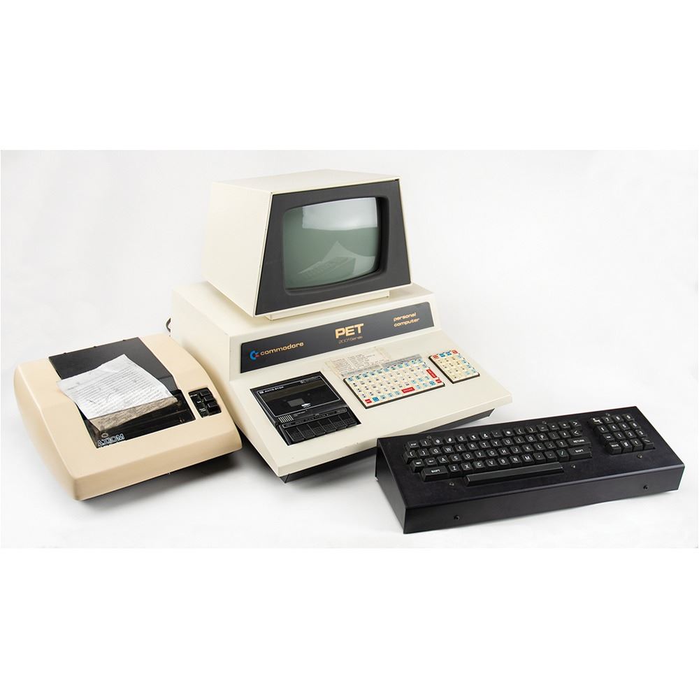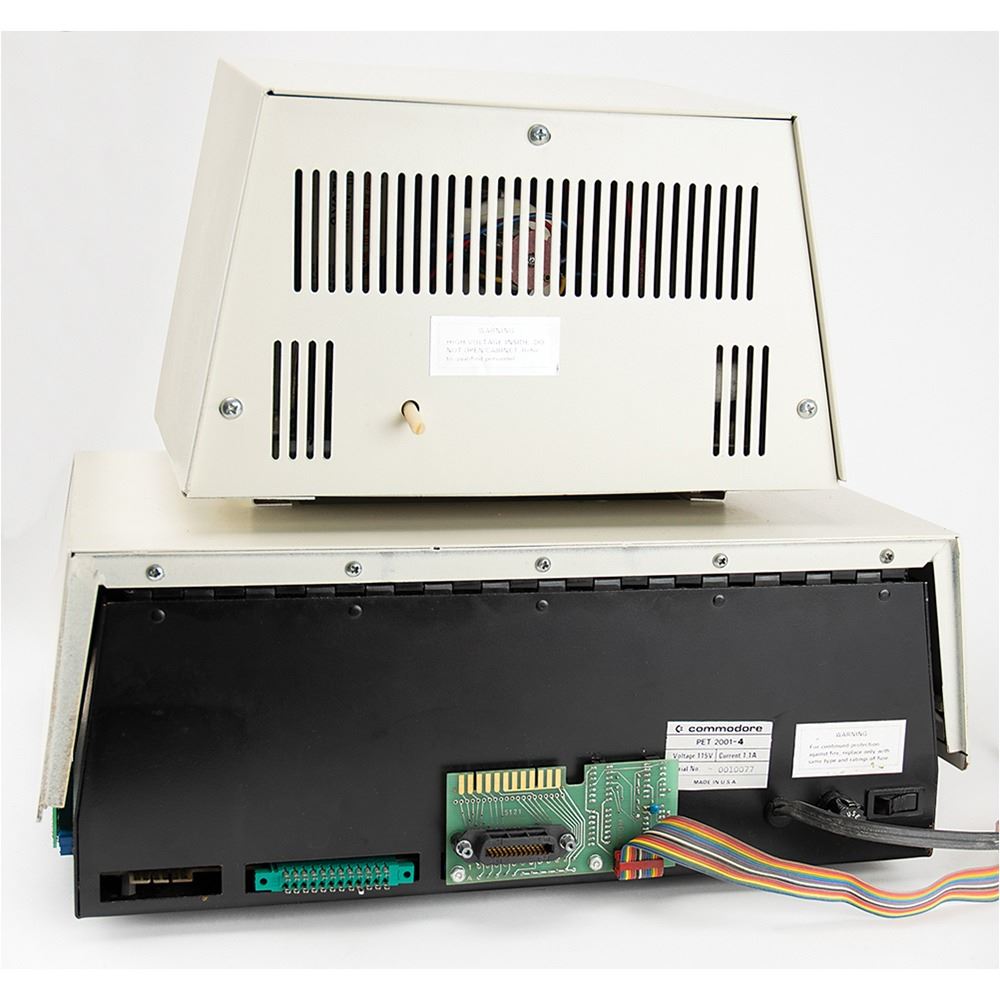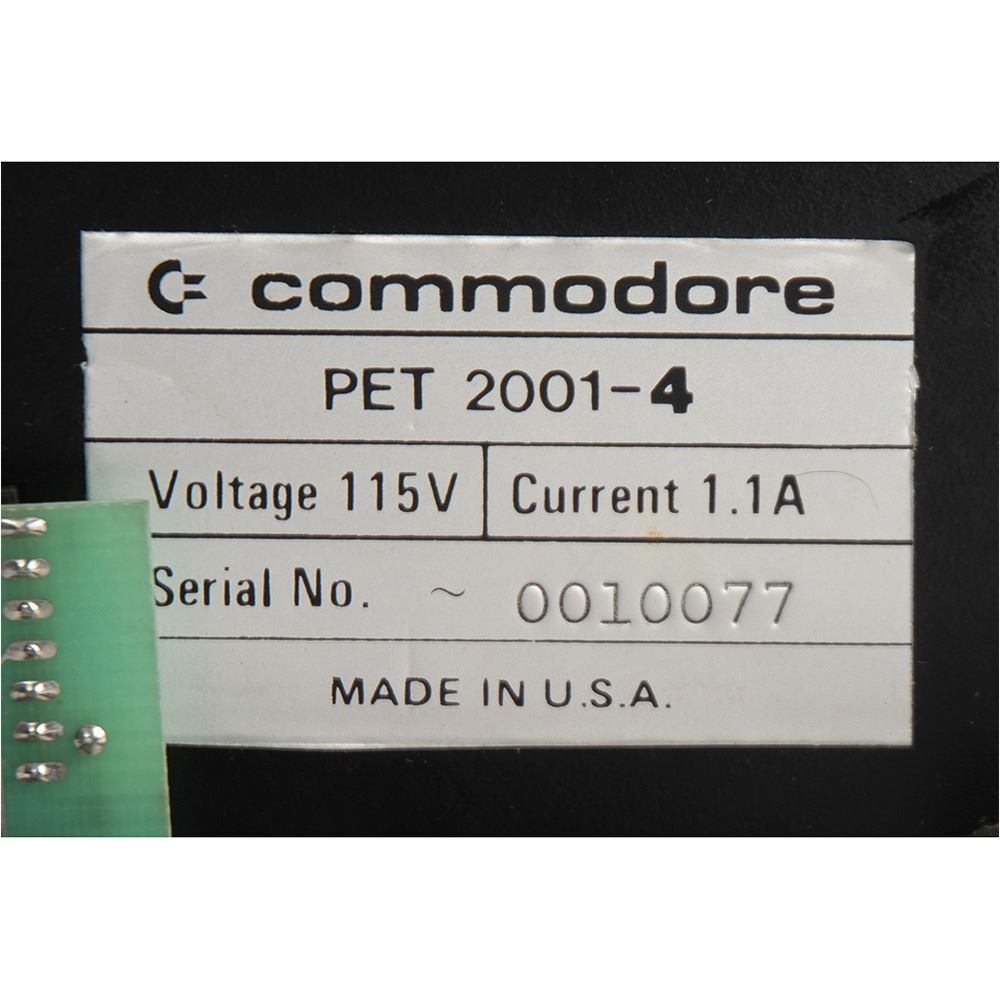 Scarce early Commodore Pet 2001 Series personal computer produced by Commodore International in 1977, Model No. PET 2001-4, with the manufacturer's plate listing the serial number as 0010077, which identifies this console as No. 77 of the computers initial run of 100 units. The PET measures 17.5 x 16 x 19, weighs approximately 25 pounds, and features a MOS Technology 6502 microprocessor (which also powered the Apple II), Commodore BASIC in read-only memory, a 53-button keyboard, a 20-button numeric keypad, a 9-inch monochrome CRT monitor (manufactured by Sony), default RAM of 4 KB, and a cassette deck recorder as a mass memory device. A hallmark of the computer is its single all-in-one housing and peculiar trapezoid-shaped monitor designed by Chuck Peddle with industrial designer Larry Hittle. The case is composed of two parts: a sturdy black base and upper white metal housing hinged to one another and designed so that it could be quickly and intuitively opened and propped like a car hood. The internal motherboard bears a 1977 Commodore International copyright and is marked PET Main Logic, ASSY320081, with an inspection label dated to November 8, 1977. Casing features affixed code and direction labels above keyboard. In fine, untested condition, with some light scuffs and marks.