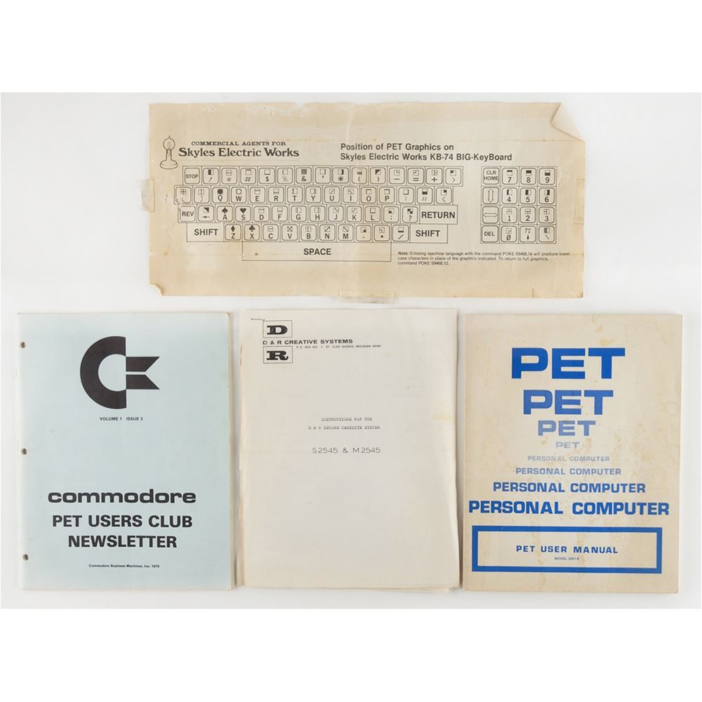 Accompaniments include: the original cardboard PET 2001-4 shipping box with 0010077 serial number; a green vinyl computer cover; a rare Skyles Electric Works KB-74 BIG KeyBoard with original design layout sheet; an Axiom EX-801 Microprinter from circa 1977-78; the original PET User manual for Model 2001-8; a Commodore PET Users Club newsletter from 1979, Vol. 1, Issue 3; and a small Commodore PET promotional toy with the original owners name.