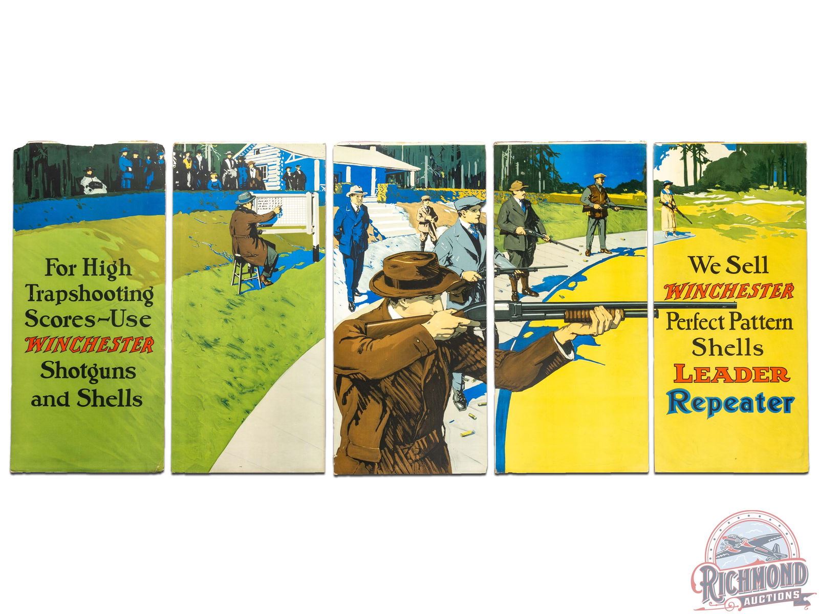 Complete single sided Winchester five panel display. Features the "High Trapshooting Scores" scene with multiple shooters and shotguns while advertising Leader and Repeater shells. Displayed from April 1-7, 1920. Panels have excellent color with a few creases, areas of loss around the edges/corners, minor rips, and areas of discoloration. The first panel has more areas of loss, specifically at the top. This is the fourth five panel display used by Winchester and is one of the earliest examples. 39.5" H x 92.5" W.