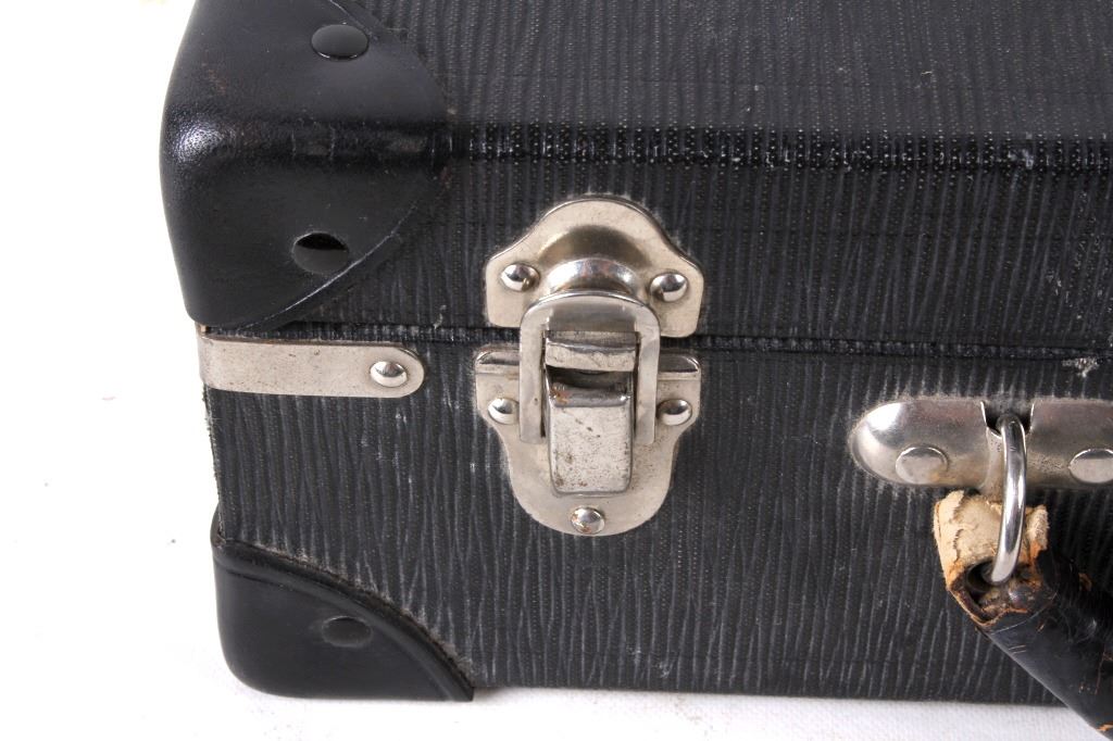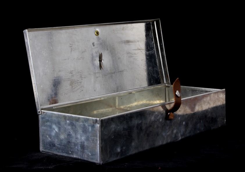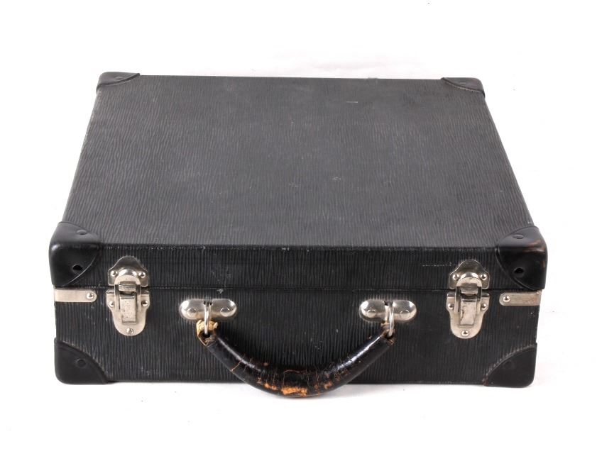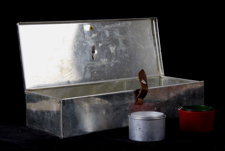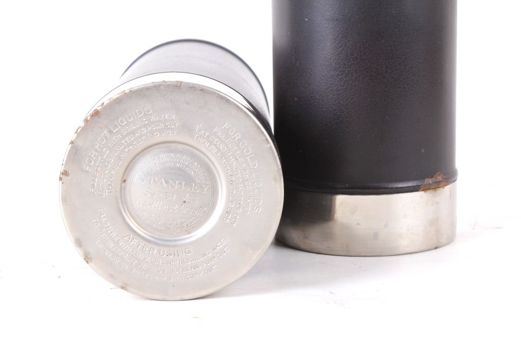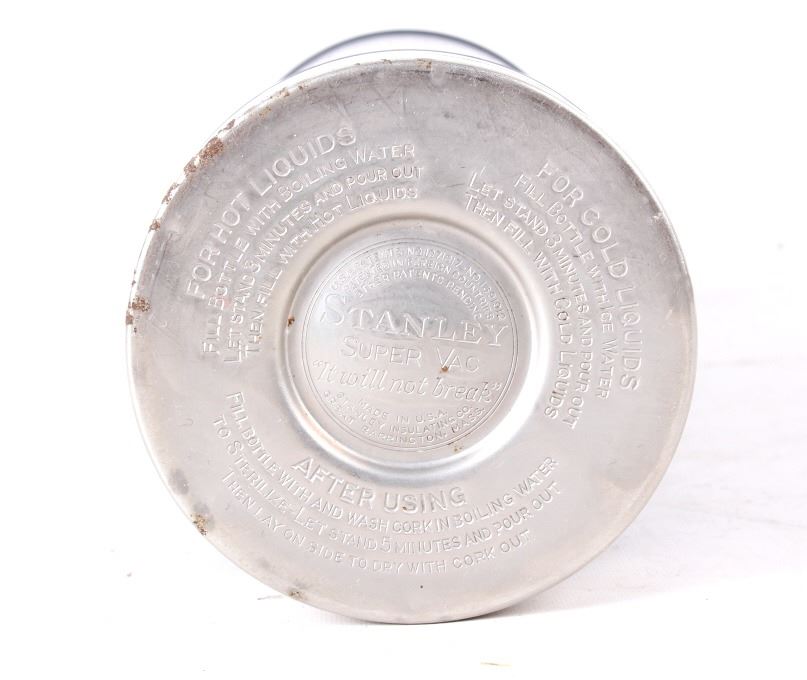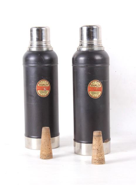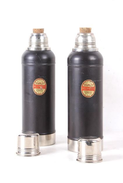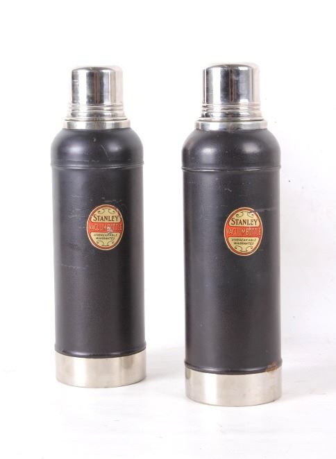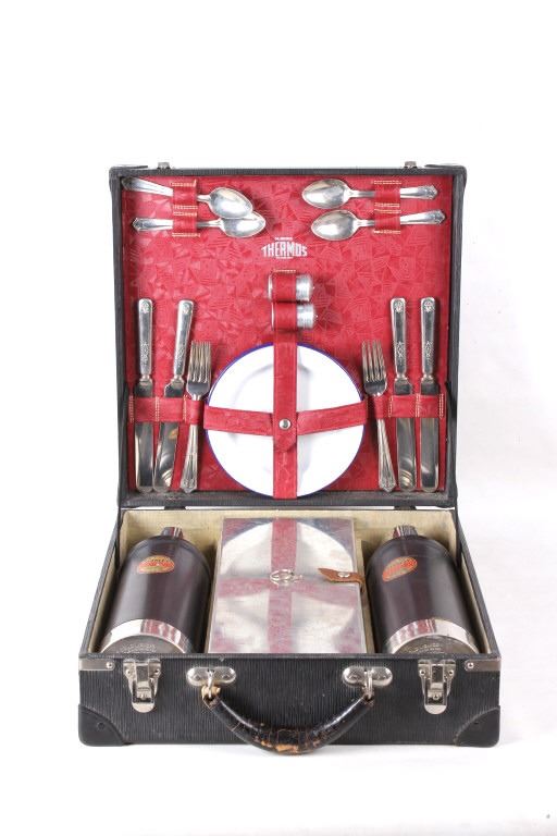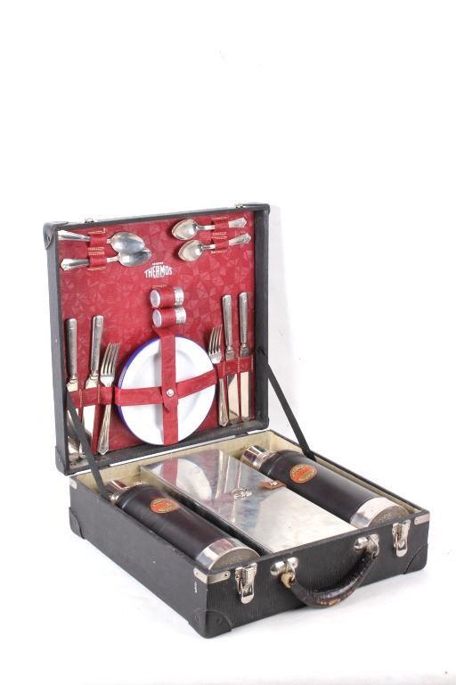 Offered for your bidding pleasure is this Early Complete Stanley Picnic Set Circa 1921. The Stanley brand has a rich 100 plus year history. In 1913 William Stanley Jr. created the Stanley bottle as a result with transformers, during which he discovered that a welding process he was using could be used to insulate a vacuum bottle with steel instead of glass. He invented fused vacuum insulation and the strength of steel in one portable bottle. This completed picnic set includes two wine thermoses as the corks are included, a complete set of silverware to serve four people, four enamelware plates that are marked "Kockums, Sweden 18cm.", a salt and pepper shaker and a small metal icebox. Inside the icebox we see six compact cups. This complete set comes encased in a very good condition picnic case. This excellent piece shows wonderful condition and quality as Stanley products are built to last. The case measures 15" wide x 15" deep X 5" tall.