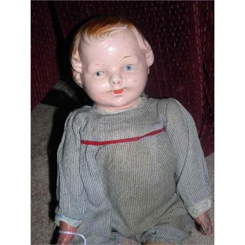 This is an early composition doll. It's a very hard head with molded hair and painted features. It has the short arms and they are pinker than the head. The one piece suit is original. It could use washing. She is from a smoke free environment. If you can love her, please bid. Buyer to pay $15 for U.S. shipping, insurance, and handling. Thanks for viewing.