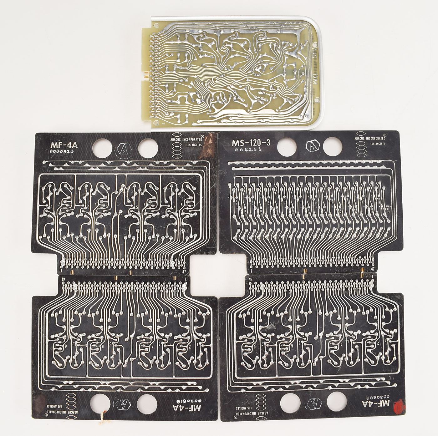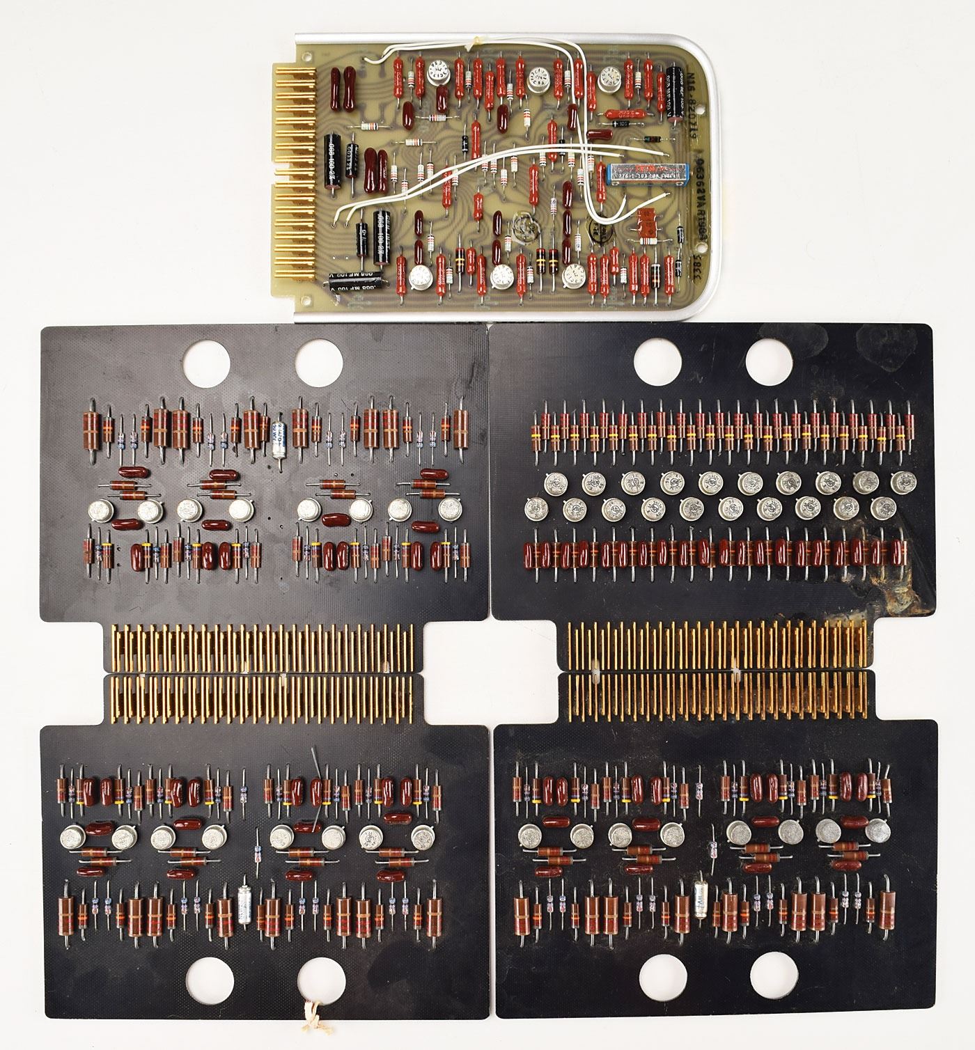 Uncommon collection of early computer parts, including: a group of four 7 x 5.5 circuit boards manufactured by Abacus Incorporated, with three designated as “MF–4A” and one as “MS–120–3”; a 4.5 x 7 circuit board marked as “DM 30 A,” with stamped part numbers: “N16–820719, 06362VAR1988, 3385,” and stamp-dated on September 22, 1966; a group of 14 logic boards, each 2.25 x 4, with several identified as “Logic Gate” drivers No. 2 or 4, with one labeled as a “Nixie Decoder,” and nine including check cards signed and dated between April and June 1969; a 7.75 x 3 PC Board with 19 Radix Inc. blocks and an attached parts tag, which reads: “Part name: P.C. Board, Serial Number: 06359–1371EWB, Vendor: Automatic, Vendor Part Number: 45140–315–1, Date: 11–26–9”; a pair of M3 patch units, both 2.75 x 2.75 x 3, model 2461A, with one featuring wire plugs to lower ports, and the other, identified as “C-7A” and “ICL,” bearing calibration and Litton Industries instrument control labels, with the latter marked “2K–402564”; and a Serial Paper Tape Reader made by DATA I/O, model 950–1950, 4.5 x 4.25 x 4.75, with front panel bearing instructions and parts label: “DATA I/O Corp., #6000264, SWO #L7017A51, P.N. 950–1950 E, Date: Oct 31, ’86.” Includes two 8? metal reels of paper tape. In overall very good to fine condition.