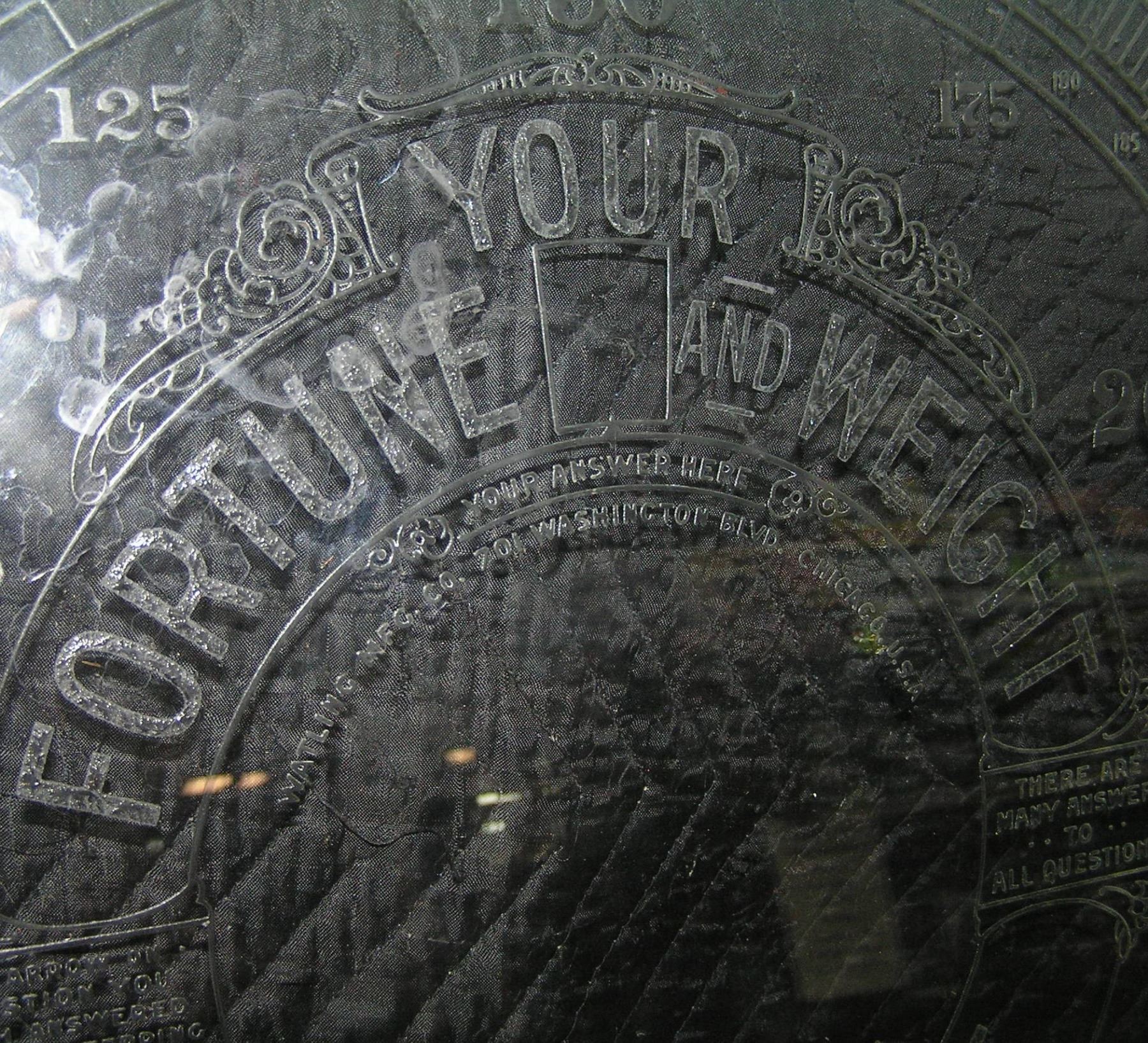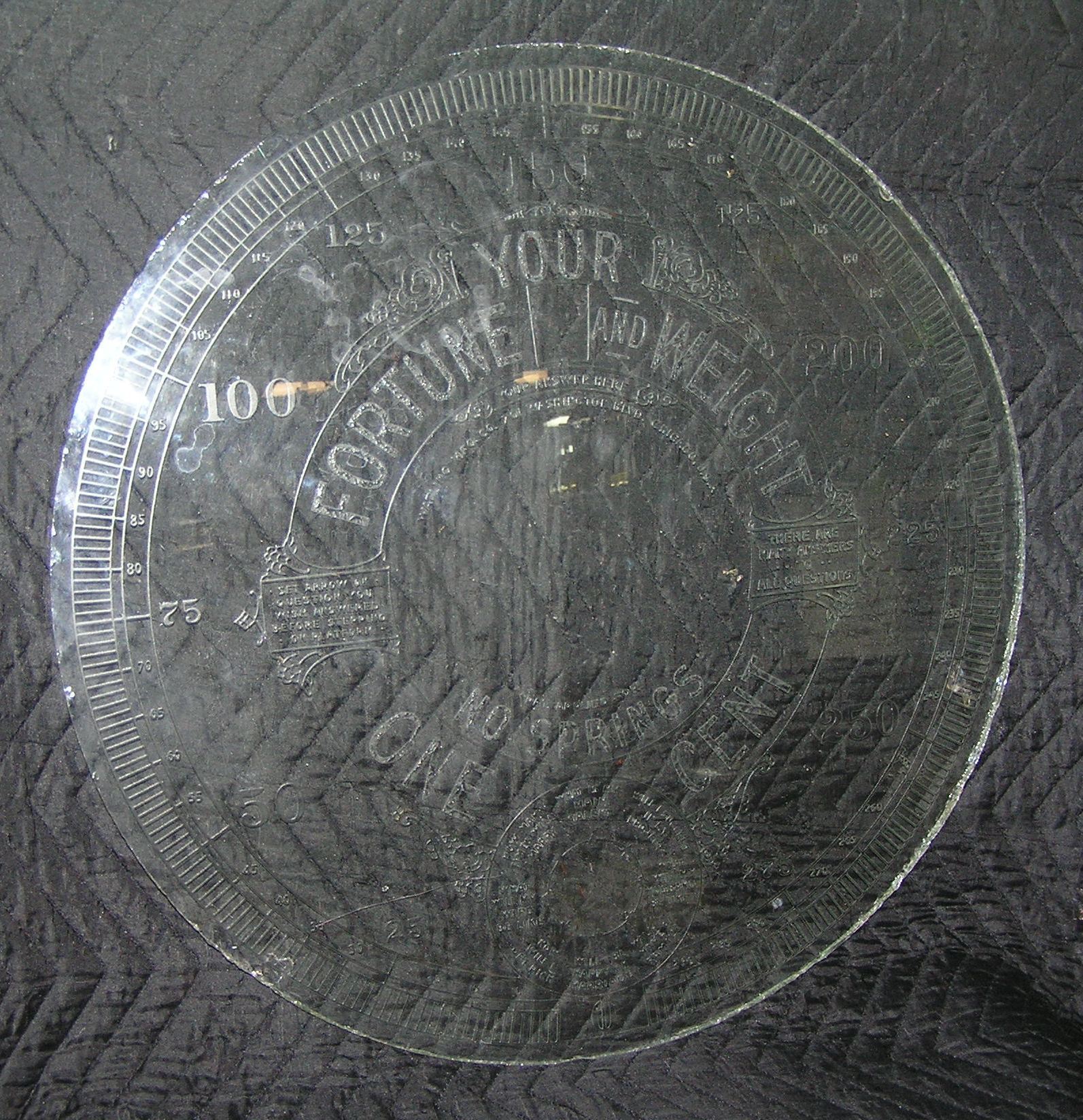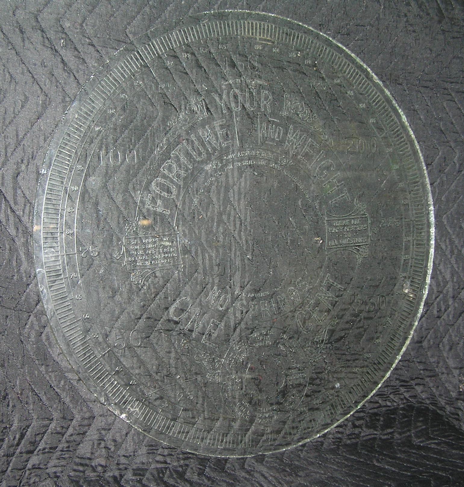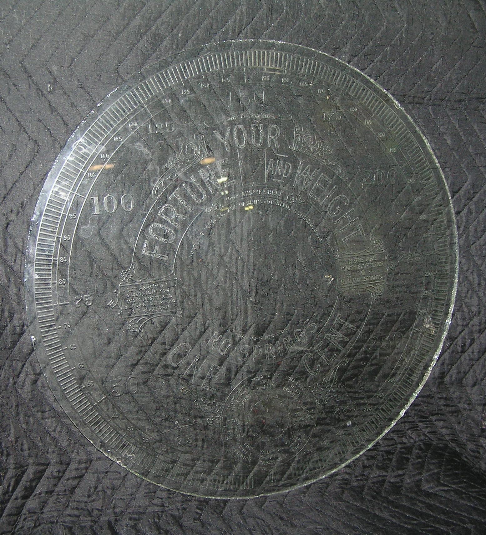 Early Coney Island 1 cent fortune and weight etched glass display piece removed from an antique scale that tells weight and fortune goes from 0 to 300 Lbs from the Watling Mfg Co. Chicago USA at Coney Island est. value $375.00-$400.00