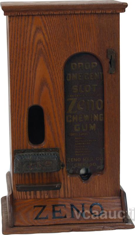 Early Countertop 1 Cent Oak Case Zeno "Wood Witness" Chewing Gum Vending Machine w/ embossed tin front w/ keys