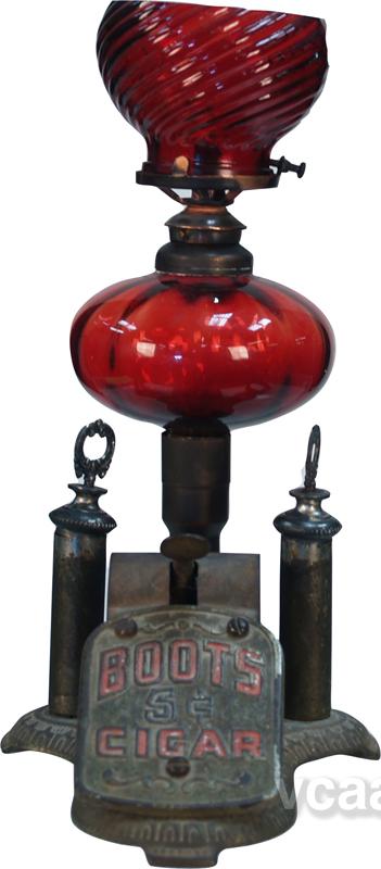 Early Countertop Cast-Iron Boots Cigar Cutter by Brunhoff MFG. Co. Cincinnati, O. w/ ruby red glass font & shade w/ 2 lighter sticks