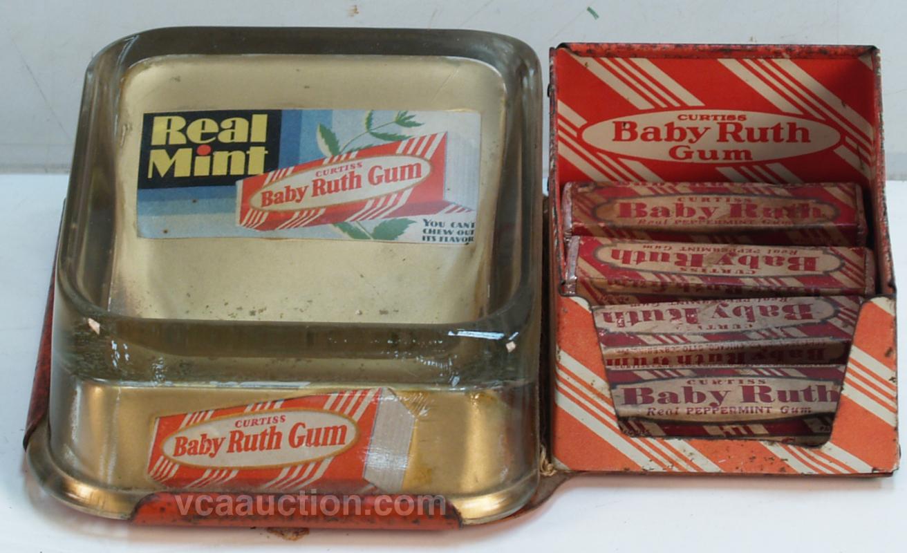 Early Country Store Countertop Tin & Reverse On Glass "Baby Ruth Gum" Change Receiver And Display w/ 4 old packs of Baby Ruth gum