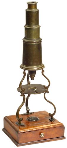 Early Culpeper-type Microscope, c. 1780 English, unsigned, height 16 1/2 in., no mirror.<Br>