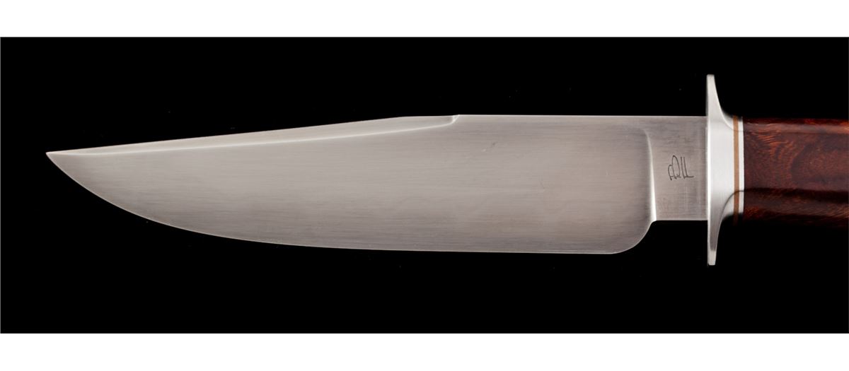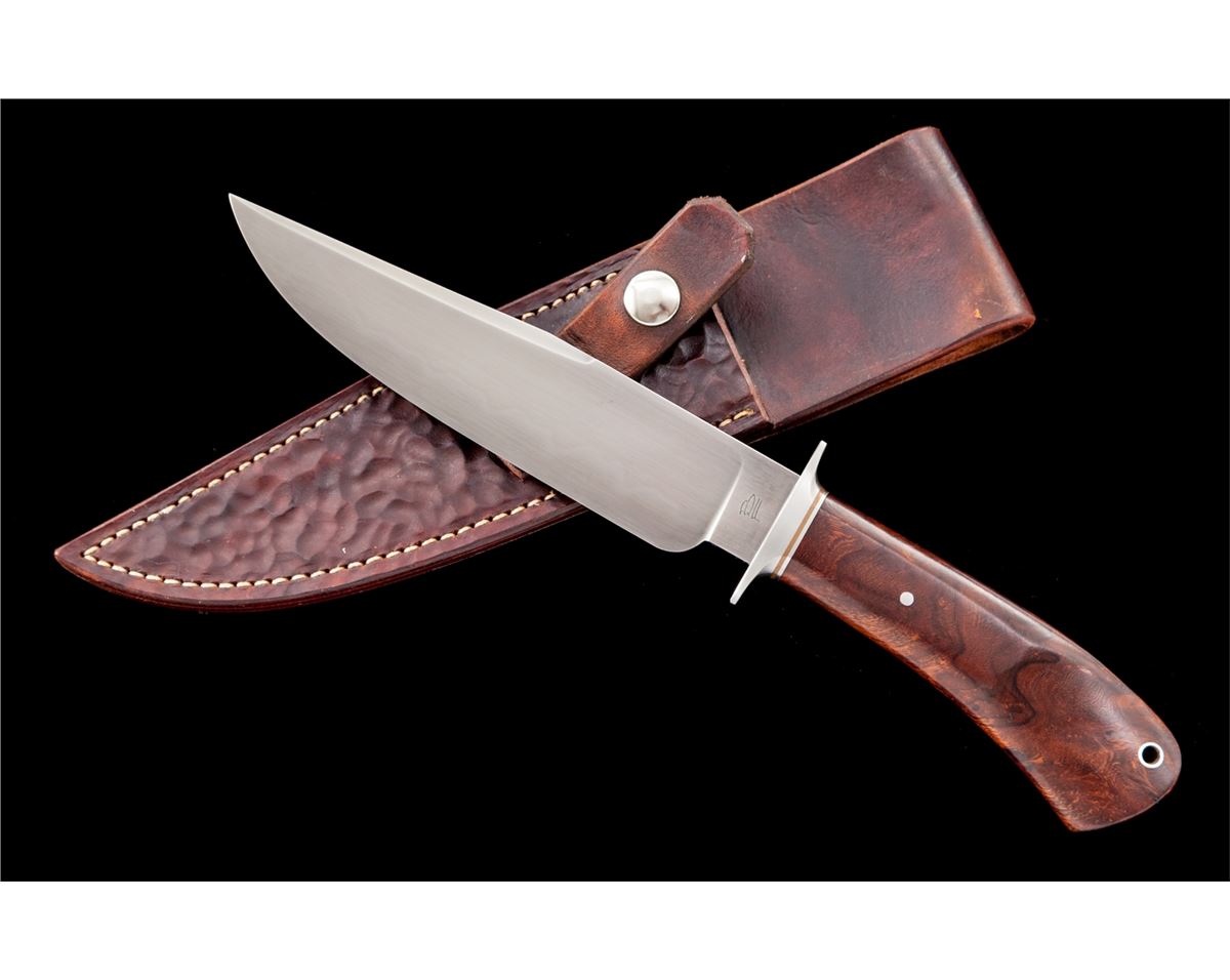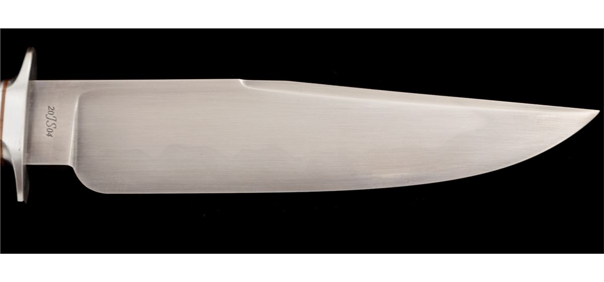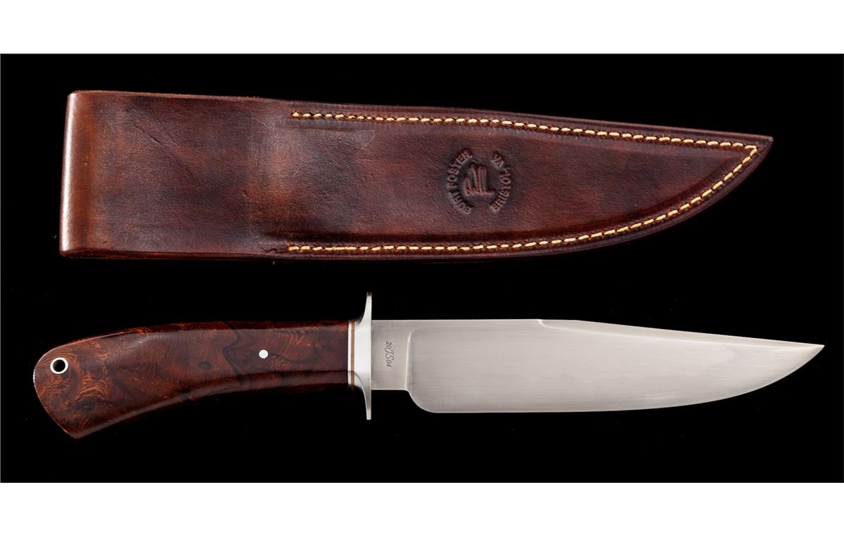 Early Custom Hunting Knife, by Burt Foster, 6-3/4'' clipped point blade has been polished to show the clay hardening line and is marked ''BF''; reverse is marked ''20JS04''; 11-5/8'' overall length, desert ironwood handle, stainless steel full guard with single copper spacer, nickel silver pins and wrist thong ferrule, in custom tooled BF leather sheath stamped ''BURT FOSTER/BRISTOL, VA''. Condition is excellent overall appearing as new and showing no use, with very light overall marks from handling. Est.: $400-$600. (Ian Shein estate)