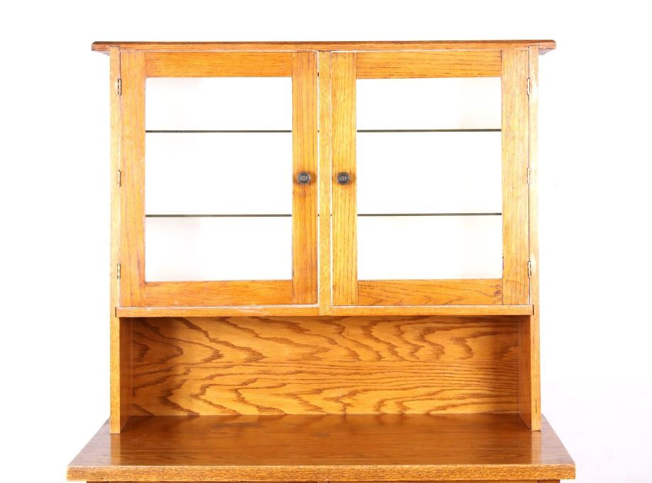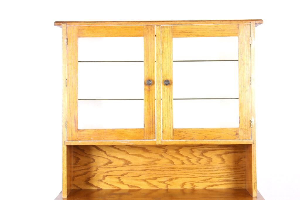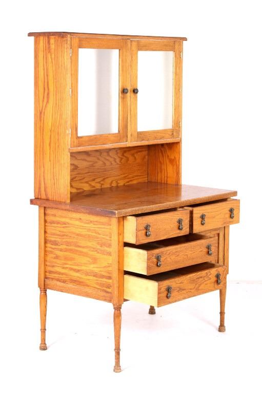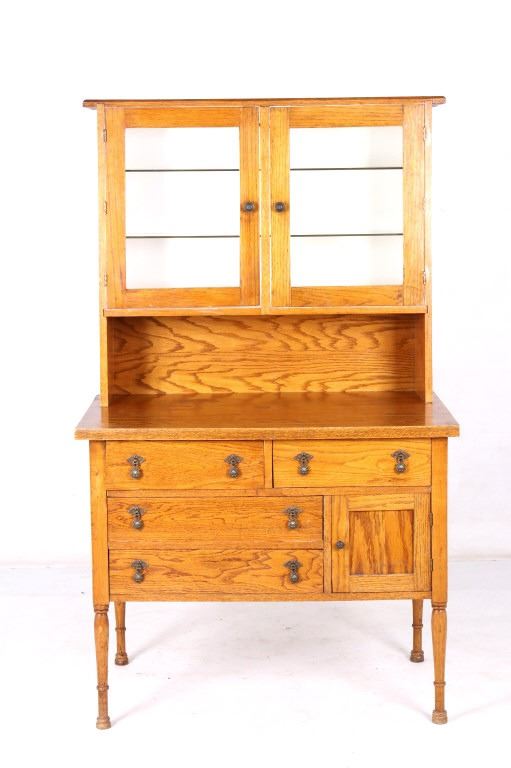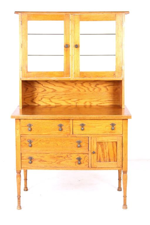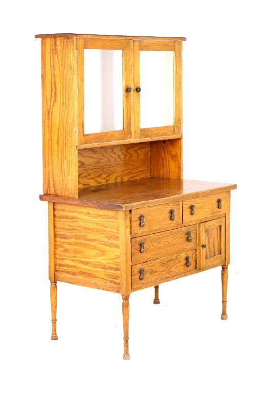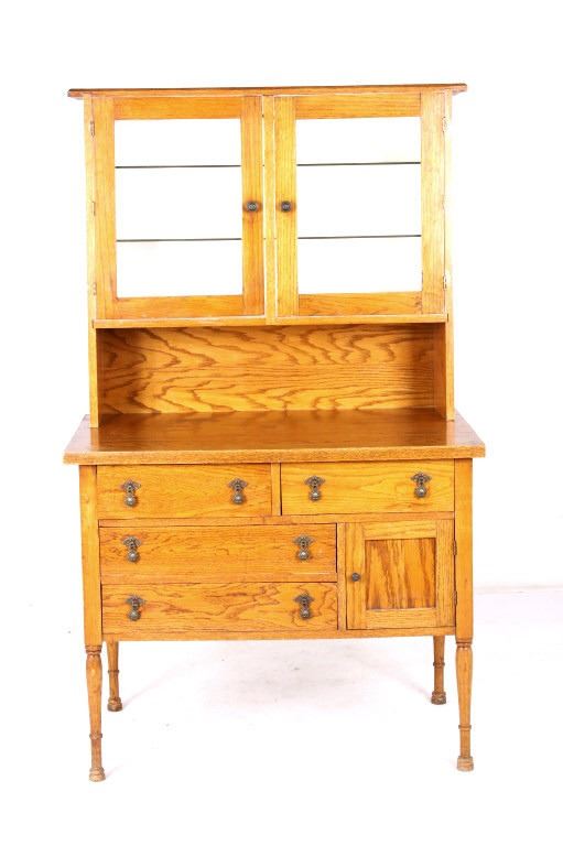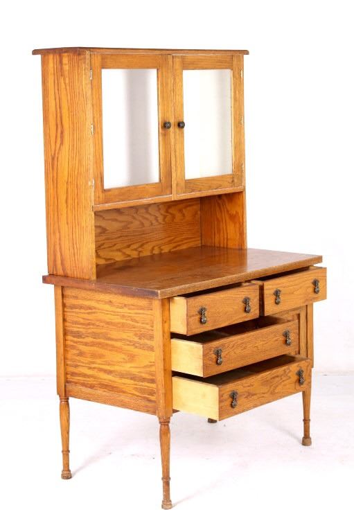Offered for your bidding pleasure is this Early Custom Quarter Sawn Oak Kitchen Cabinet circa late 1800's. This cabinet displays a two piece construction, the bottom half showing four drawers and one cabinet. The top section to this hutch displays two glass cabinets which come with two glass shelves for kitchen storage or display. This kitchen hutch was hand crafted and custom made for a family in the late 1800's. The cabinet shows a well built sturdy construction out of quarter sawn oak with brass hardware. Many homes were not built with kitchens in the late 1800's. This cabinet is a type of cupboard or free–standing kitchen cabinet that served as a workstation in most kitchen's in the late 1800's to the early 1900's. This piece is in excellent condition and measures 63 1/2" tall, 23" deep and 38" wide.