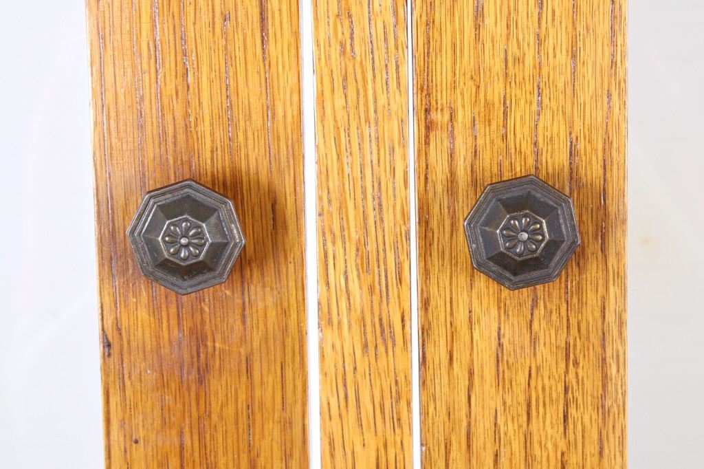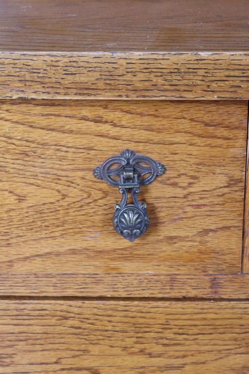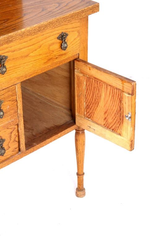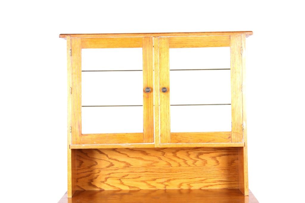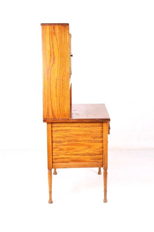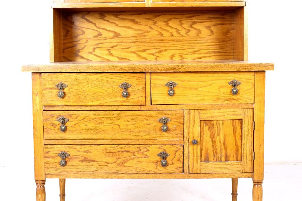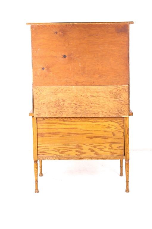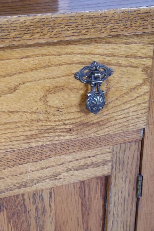 Offered for your bidding pleasure is this Early Custom Quarter Sawn Oak Kitchen Cabinet circa late 1800's. This cabinet displays a two piece construction, the bottom half showing four drawers and one cabinet. The top section to this hutch displays two glass cabinets which come with two glass shelves for kitchen storage or display. This kitchen hutch was hand crafted and custom made for a family in the late 1800's. The cabinet shows a well built sturdy construction out of quarter sawn oak with brass hardware. Many homes were not built with kitchens in the late 1800's. This cabinet is a type of cupboard or free–standing kitchen cabinet that served as a workstation in most kitchen's in the late 1800's to the early 1900's. This piece is in excellent condition and measures 63 1/2" tall, 23" deep and 38" wide.