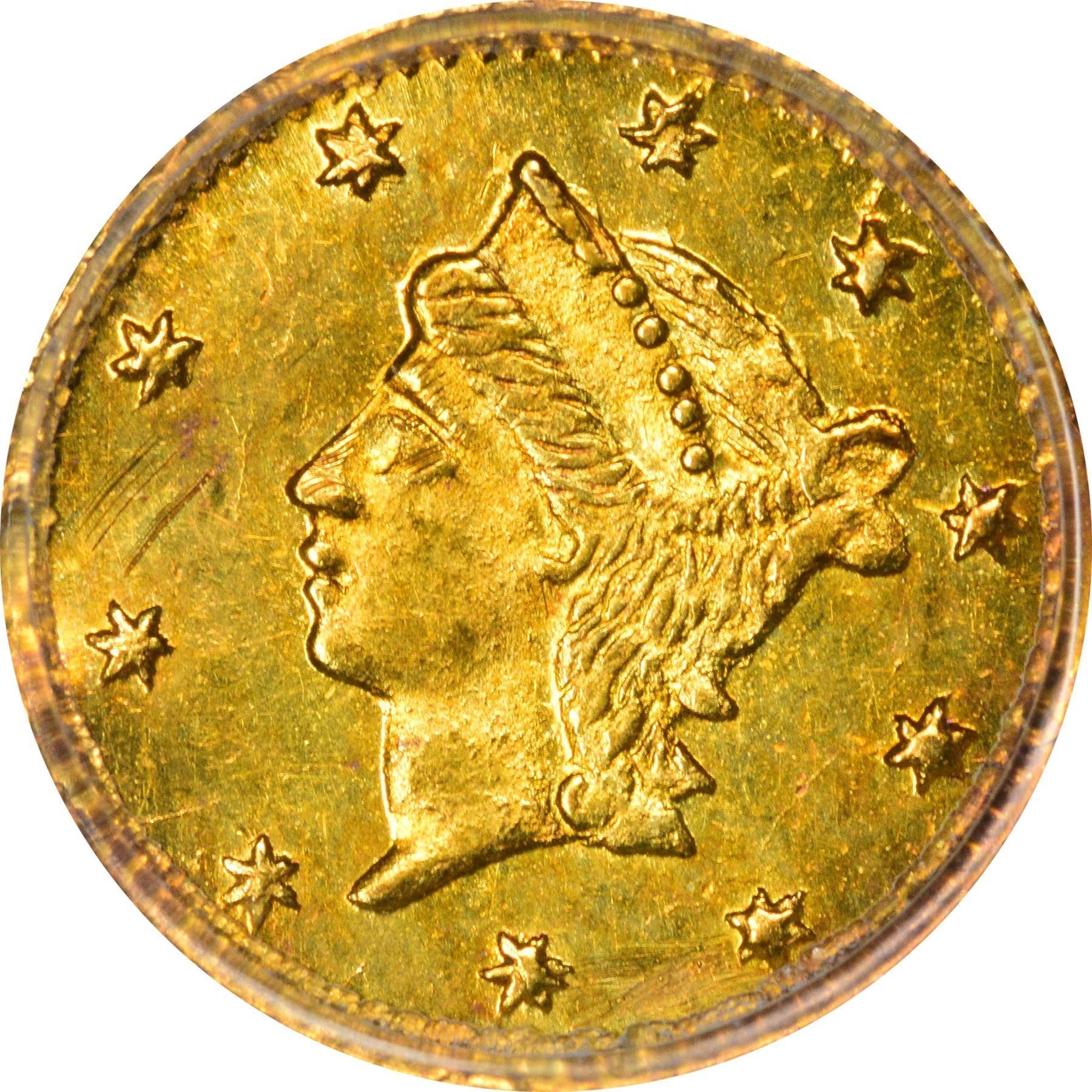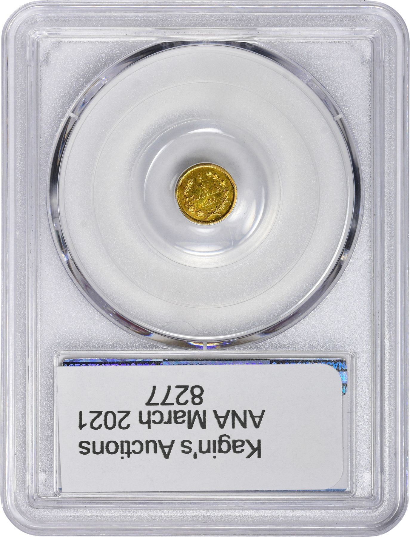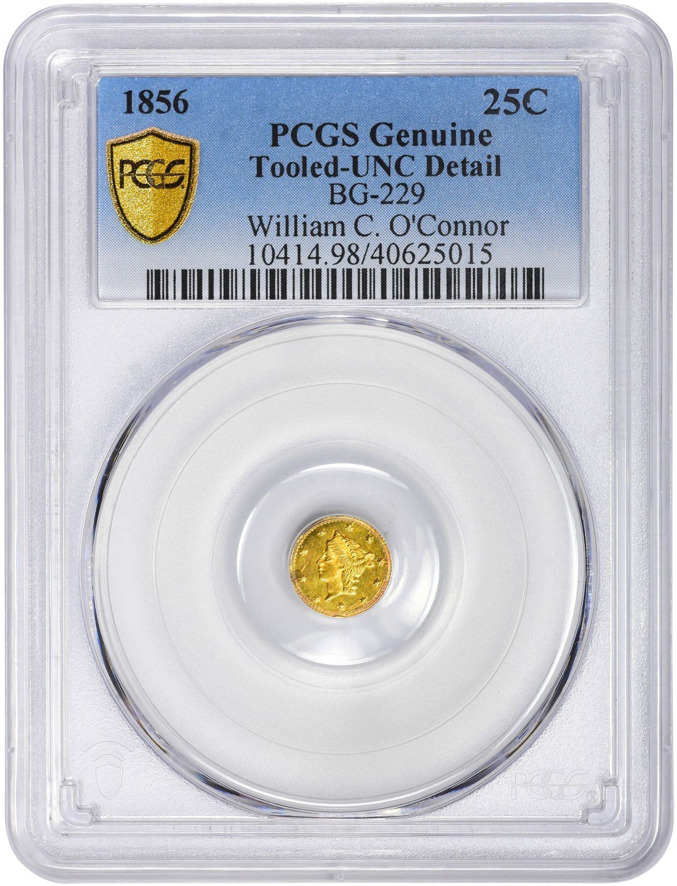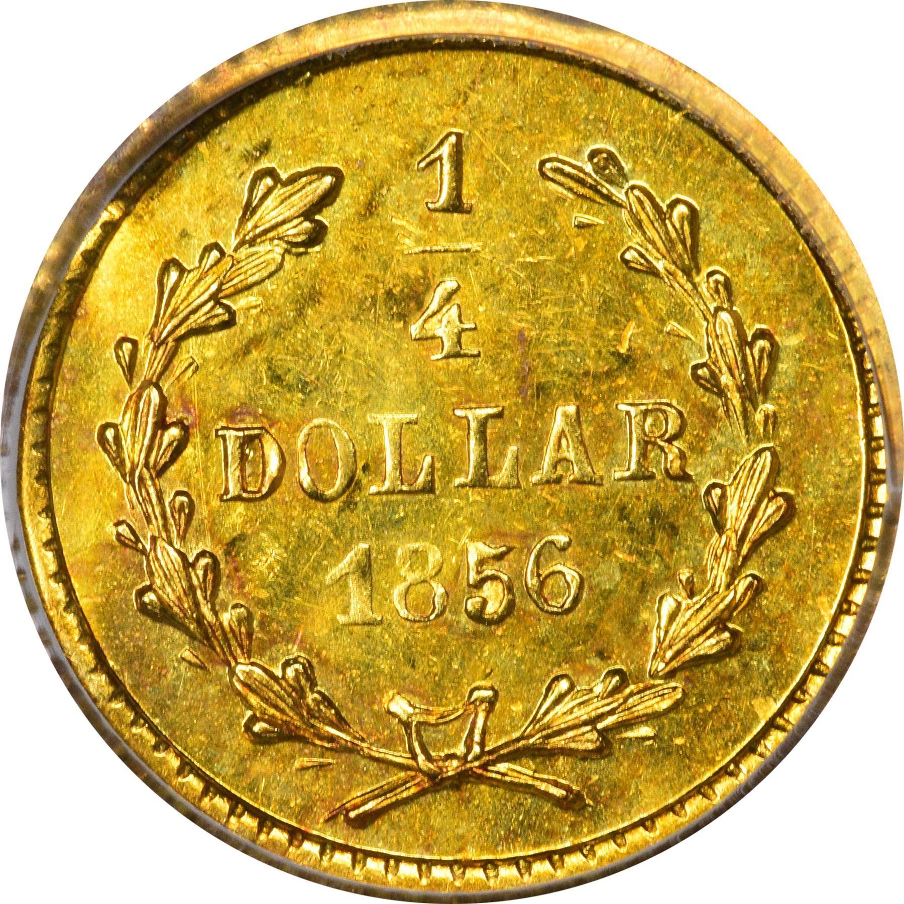 Description: 1856 round ¼ Dollar, BG-229, Die State I (most field flaws removed by repolishing, wreath complete), PCGS Genuine, Tooled - UNC Detail. One was presented to the British Museum in September 1857 by Mr. Thomas Alcock, proof of Period One origin of this type. Same obverse die as BG-228, still further repolished. Made by Nouizillet. Shiny, looks Uncirculated, but "tooled" (planchet slightly bent). PCGS Genuine Tooled-UNC Detail William C. O’Connor (PCGS# 10414).