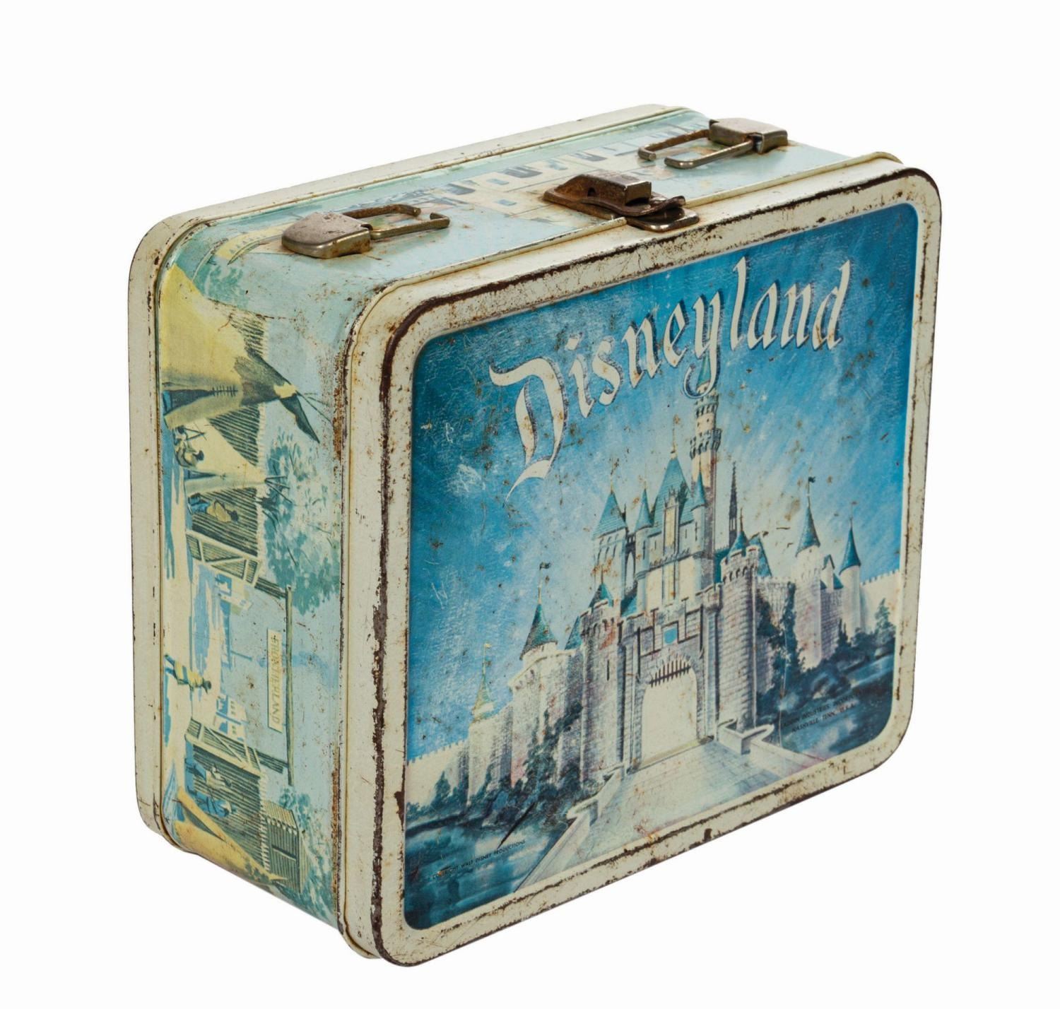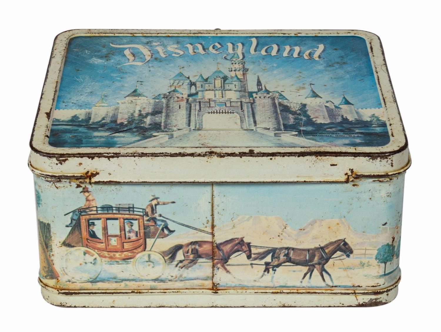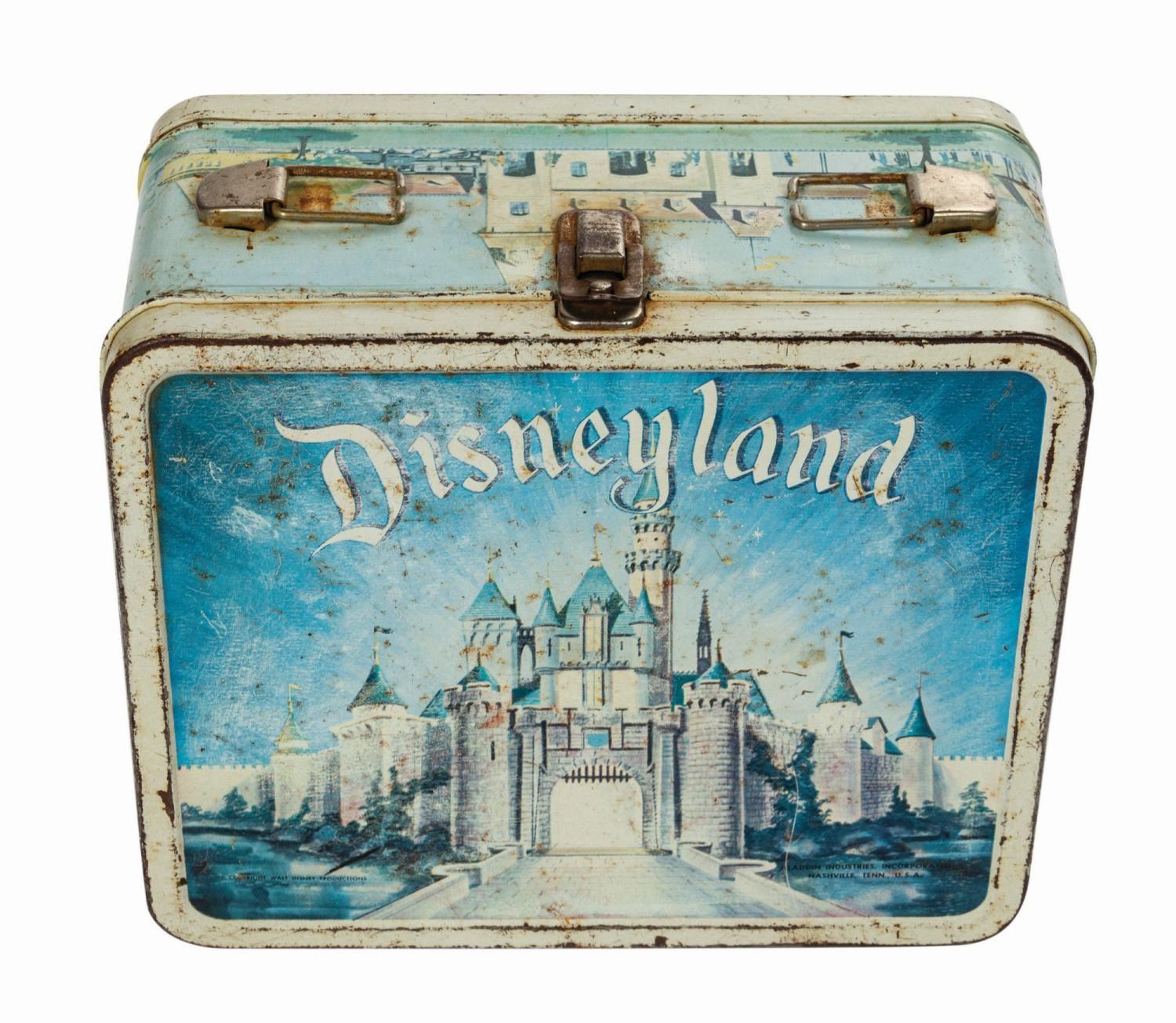 (Disneyland, c.1957) A fantastic souvenir Disneyland lunch box from the early years of the park. It features an image of Sleeping Beauty Castle on one side and the Jungle Cruise on the other. Frontierland, Tomorrowland, and Main Street are represented on its sides. Measuring 7"x8" and 4" deep, the lunch box is in fair condition with moderate to heavy surface wear, including rusting, paint loss, and color fading throughout. The plastic handle is missing, and the interior lacks its metal thermos clip and shows some rusting as well.