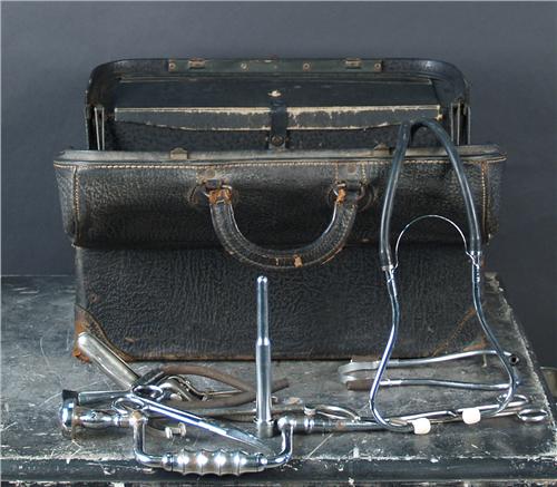 Early Doctors' Bag with Tools & compartments  Has all pieces intact including a bone drill