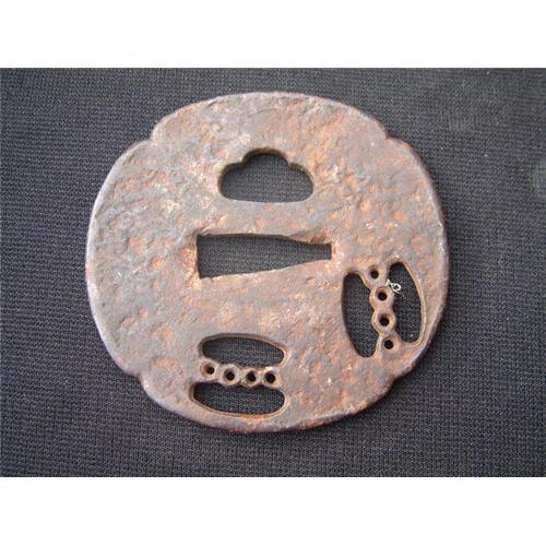 Early Edo period Japanese iron oval four-lobes shape (tate maru gata) tsuba. The design features open work ornaments (sukashi) with 4 round openings. Only 2 openings are present in the tsuba, as the kozuka opening (kozuka hitsu ana) is missing. Diameter: 3.5" (9 cm.). Estimated market value: $2500. Provenance: Dr. Veleanu's collection, the author of the collectors' reference book: "Antique swords and daggers".