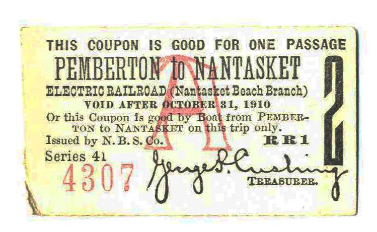 Early electric rail ticket from Hull, Massachusetts. Reads in part: ''This coupon is good for one passage / Pemberton to Nantasket / Electric Railroad (Nantasket Beach Branch) / Void After October 31, 1910''. Ticket measures 2.25'' x 1.25'', with even toning. Near fine.