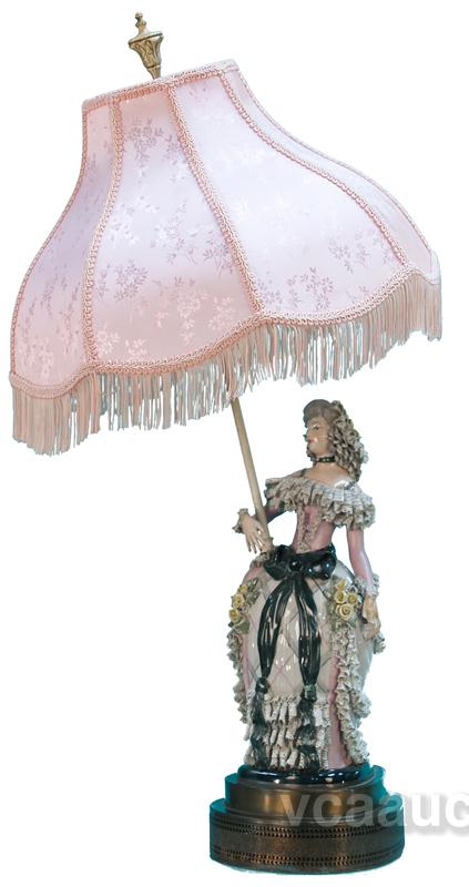 Early Electric Table Top Victorian Lady Figural Lamp w/ pink tassel lamp shade