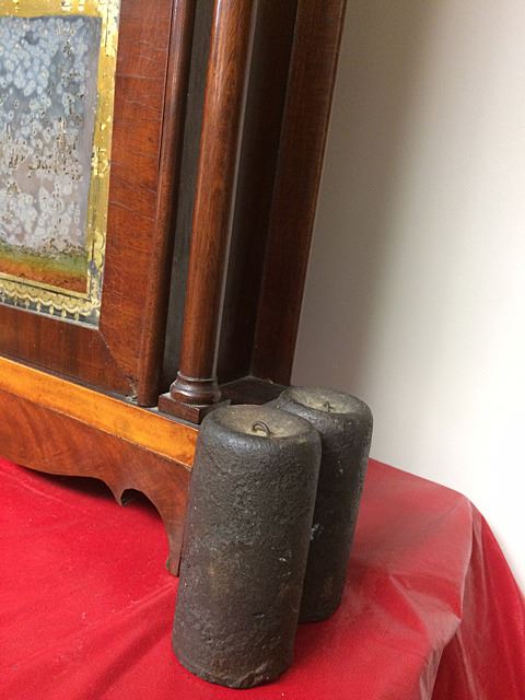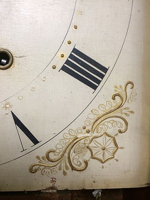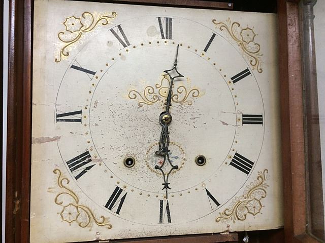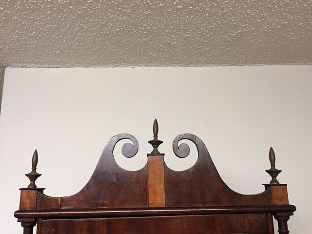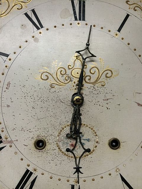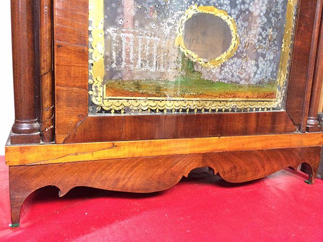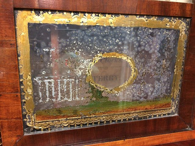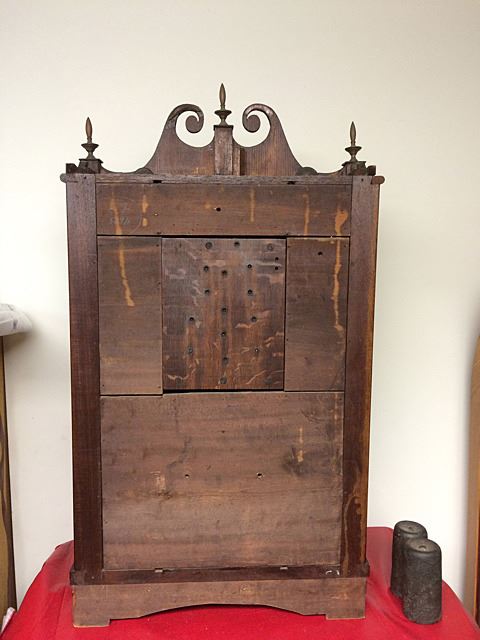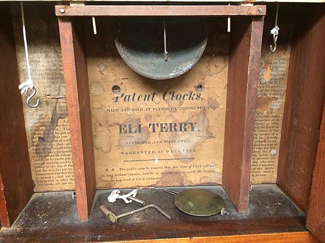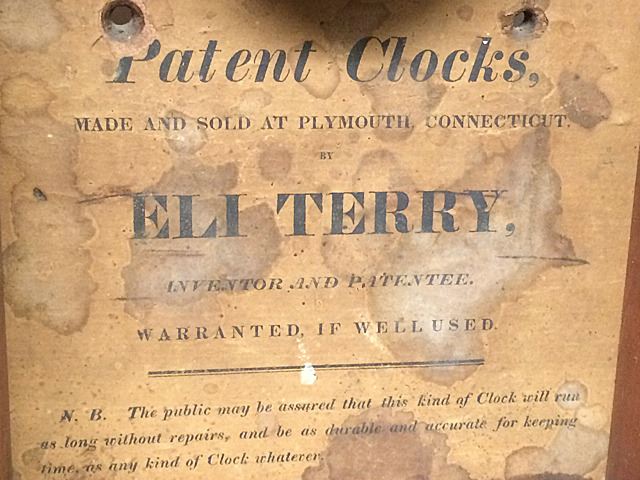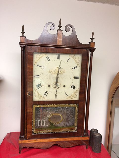 Early Eli Terry Pillar and Scroll Clock, Plymouth, CT, c. 1820s, very early and uncommon case with thinner, exagerated scrolls, longer skirt at base, 3 spear point finials, original hand painted dial with raised gold gilt in corners, and in center, roman numerals, original hands, reverse painted lower tablet (some loss), wooden works, weight driven, key wind, pendulum, very nice label "Patent Clocks, Made and Sold at Plymouth, Connecticut by Eli Terry, Inventor and Patentee". Very nice early Eli Terry pillar and scroll clock.