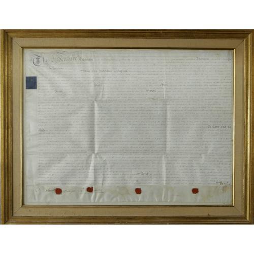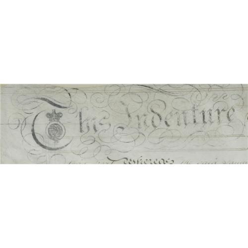 <B> Early English Indenture.</B></I> One page, 30.0" x 22.0", Somerset County, December 24, 1805. A huge manuscript legal document between John Tucker and Samuel Burage. The entire surface of this huge folio sheet is rendered in precise calligraphy. An embossed blue paper seal bearing the Royal Arms is affixed to the upper left corner. Four textured red wax seals are placed along the bottom margins, two of which are accompanied by the signatures of the principals named above. Some fading, folds per usual. Fine condition. <BR><BR><B>Important notice:<