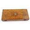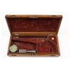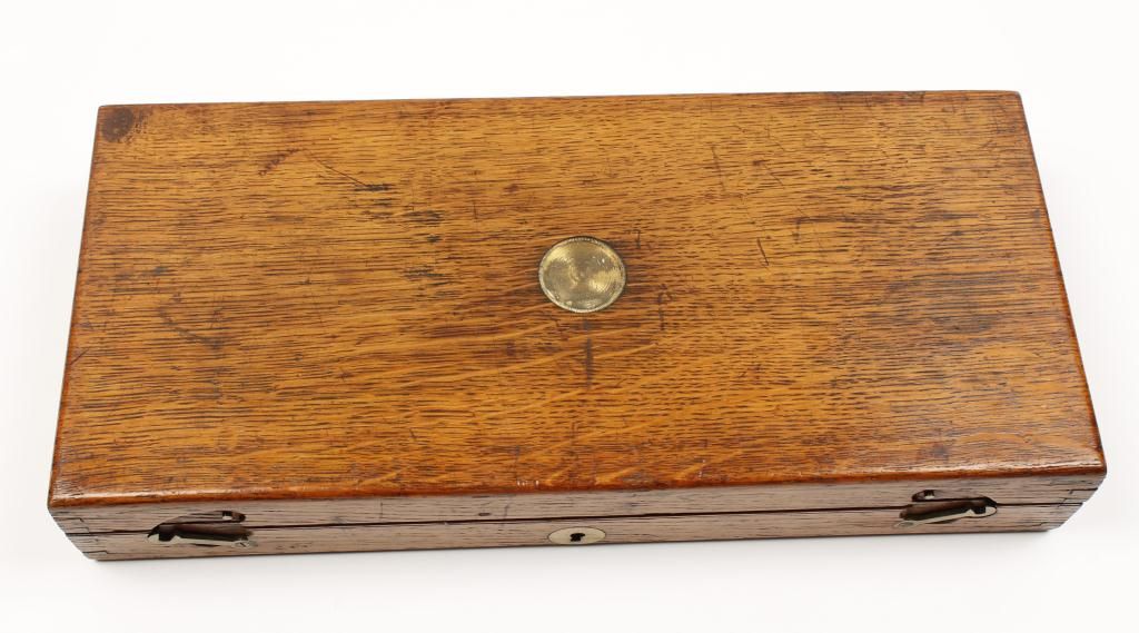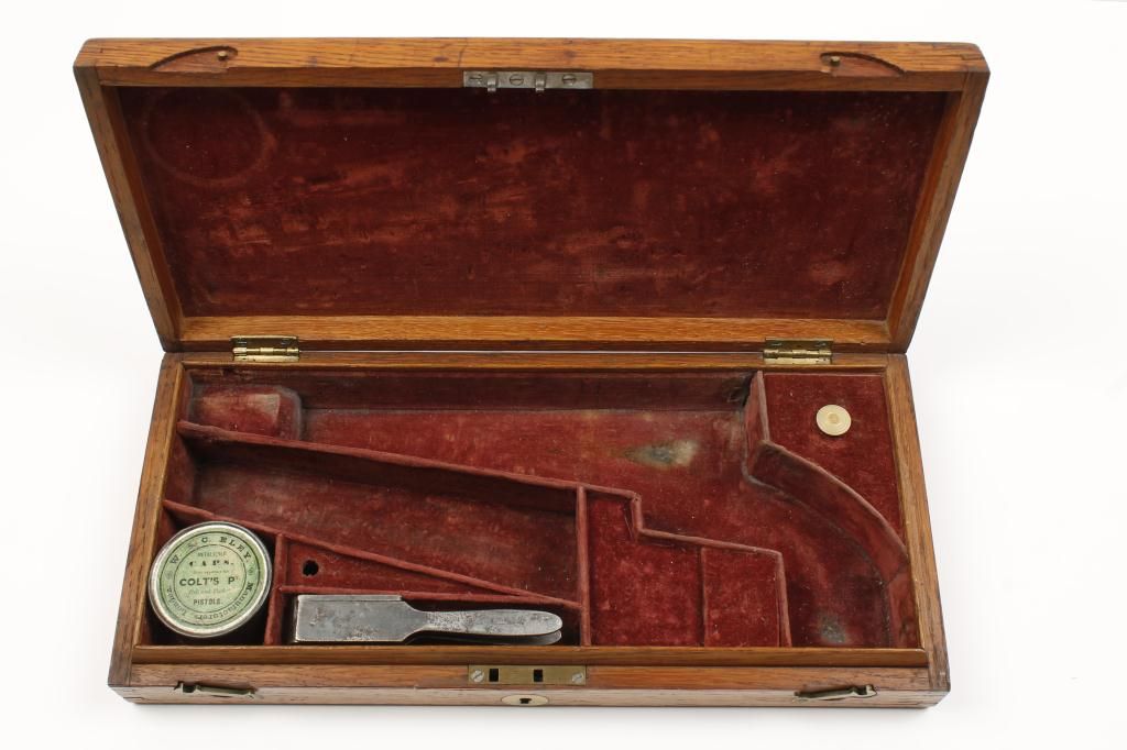 Early English Navy case with raised compartment for capper and red velveteen lined with oak exterior and brass mounts. This case will take an early London Navy or square back. The interior of the case is invery good condition showing some normal fading, slight impressions and just minor age. The case in our opinion would go well with a pistol retaining up to 80% original finish. The case retains its originalcompartment cover along with large-size cap tin showing full label and a blued and unmarked .36 caliber mold that is very similar to Colt but shows no markings and has some pitting. The exterior of the box is ingood to very good condition and retains all brass hardware. A very desirable Colt accessory that is absolutely genuine. Est.: $2,500-$5,000.
