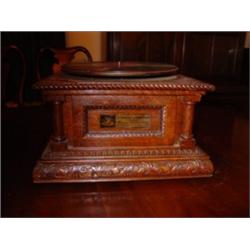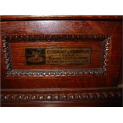 Early French Phonograph by Cie Francaise du Gramophone, Paris (label) with horn. Great oak base with red baize working turntable, gadrooned edge, engaged columns, carved leaf design around bottom and egg and dart molded side panels. Japanned metal bracket holds brass playing arm and witch's hat horn. Some modification (three plugged holes on one side). Rust on horn mount, horn has pressure crack on body and one inch 'tear' along rim. Base is 8.5" tall and 13" square. Horn is 22.5" long and 12.5" in diameter.