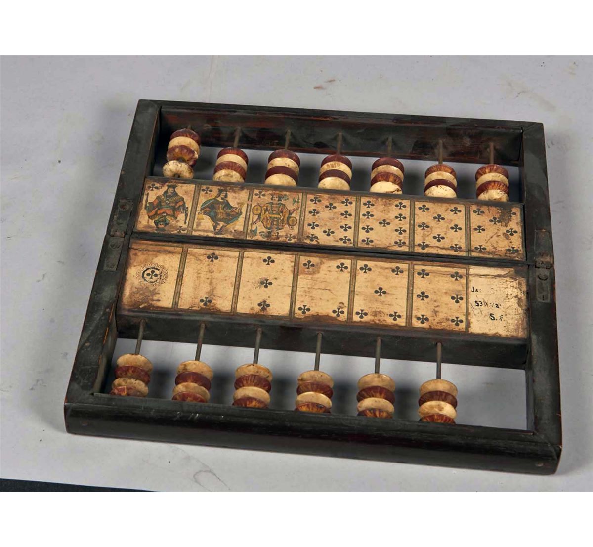 with club card faces & ivory beads/counters on metal holes, Has partial maker's label, but words are incomplete "Ja...53...S.F.", Presumably from San Francisco maker, w/ some minor wear Condition Good Size 11.5" x 11.5"