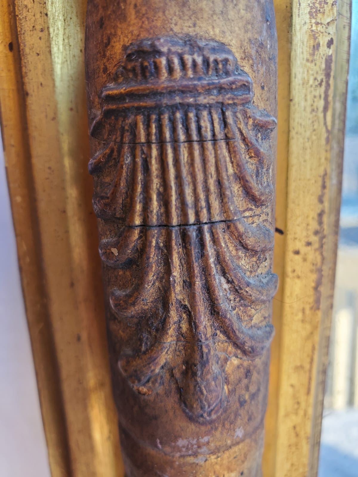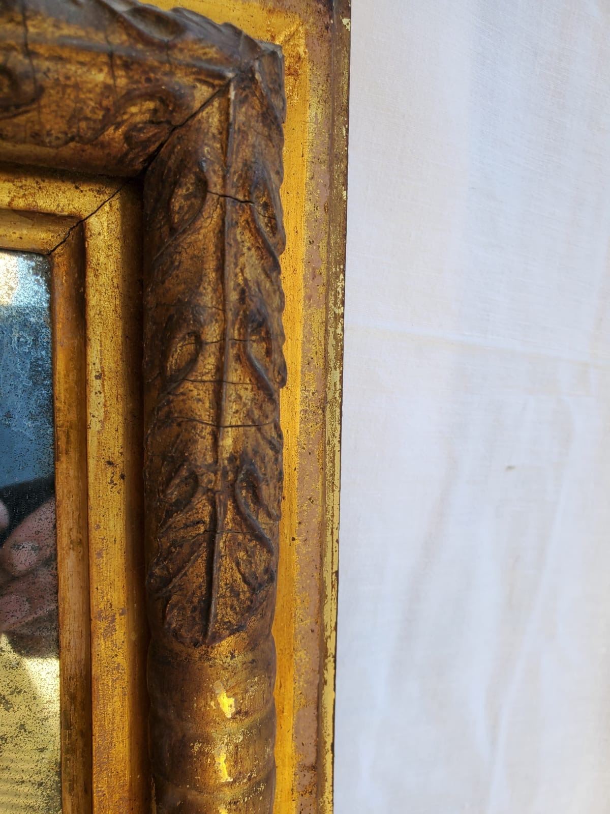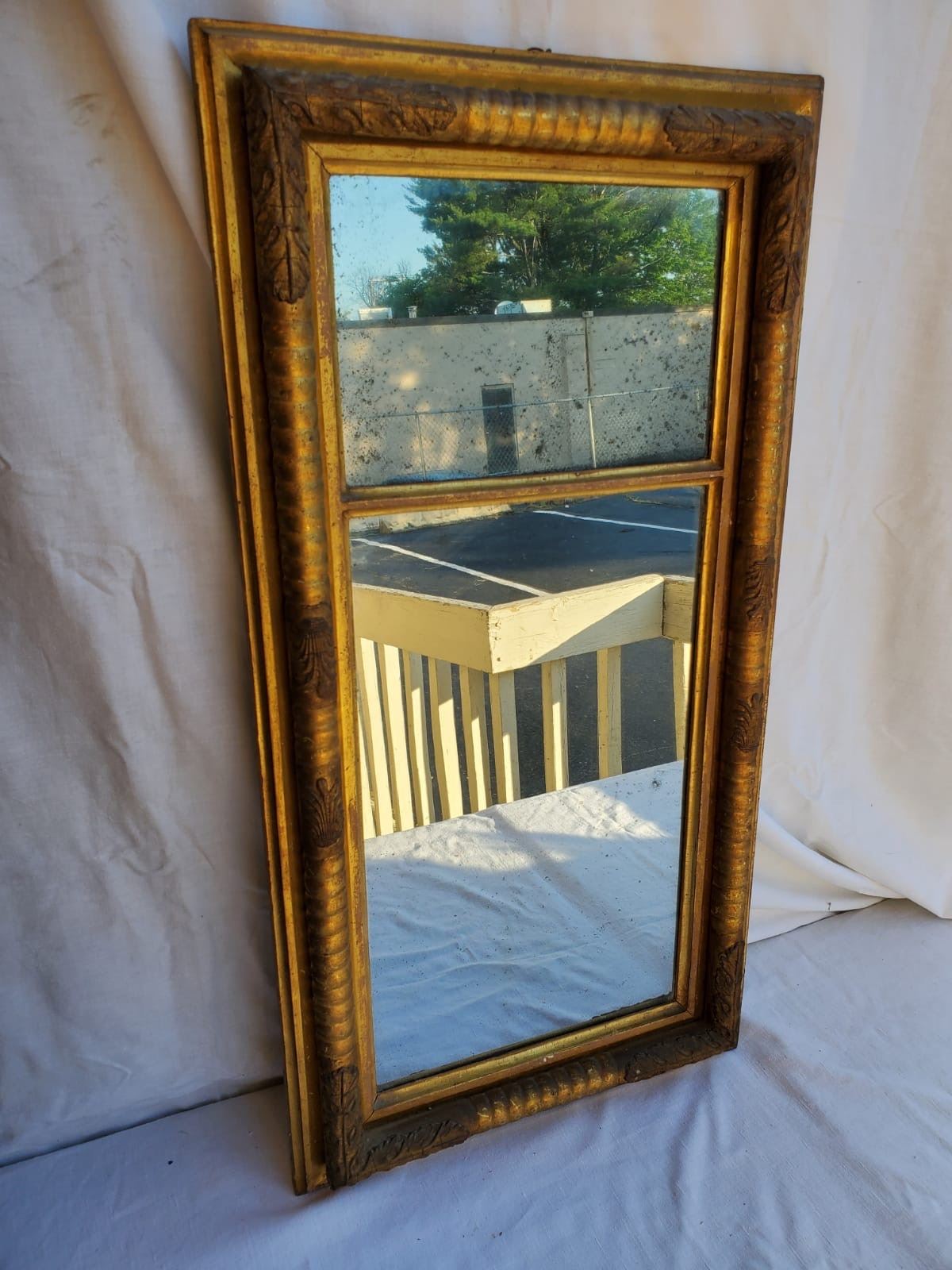 Early Federal Mirror with gold gilt, 2 part mirror, with carved detailing along the edges, measures approx. 34 In. tall.
