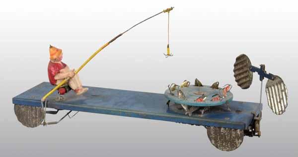Description French. Unusual rubber band driven mechanism needs adjustment to work properly. Includes one celluloid figure of man fishing marked "France" on back. Condition (Very Good). Size 16" L.