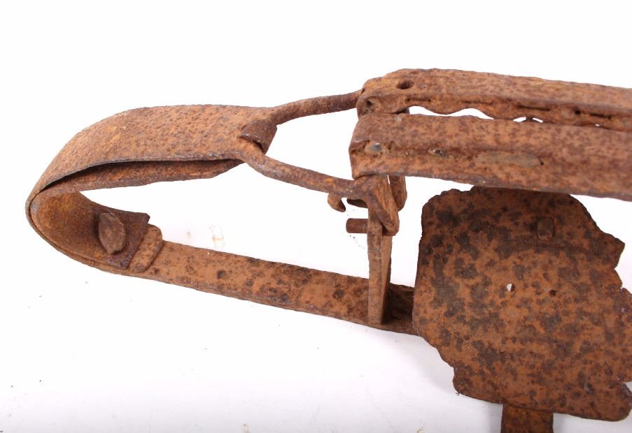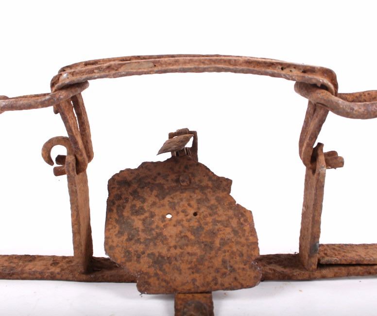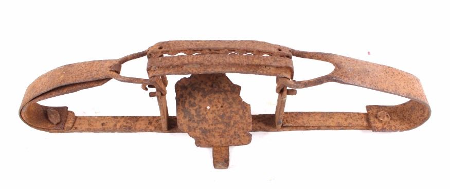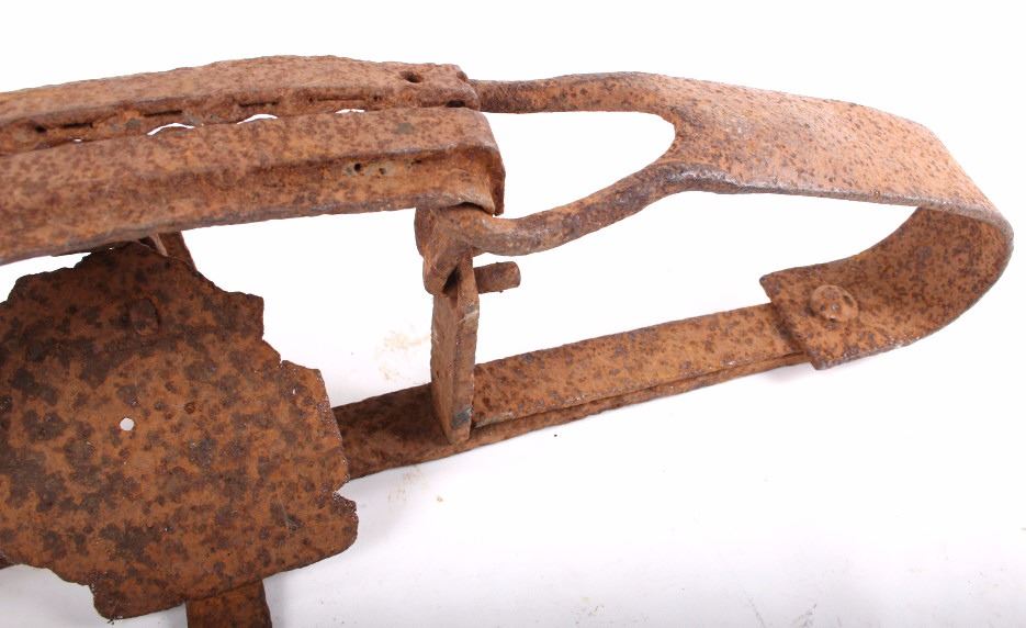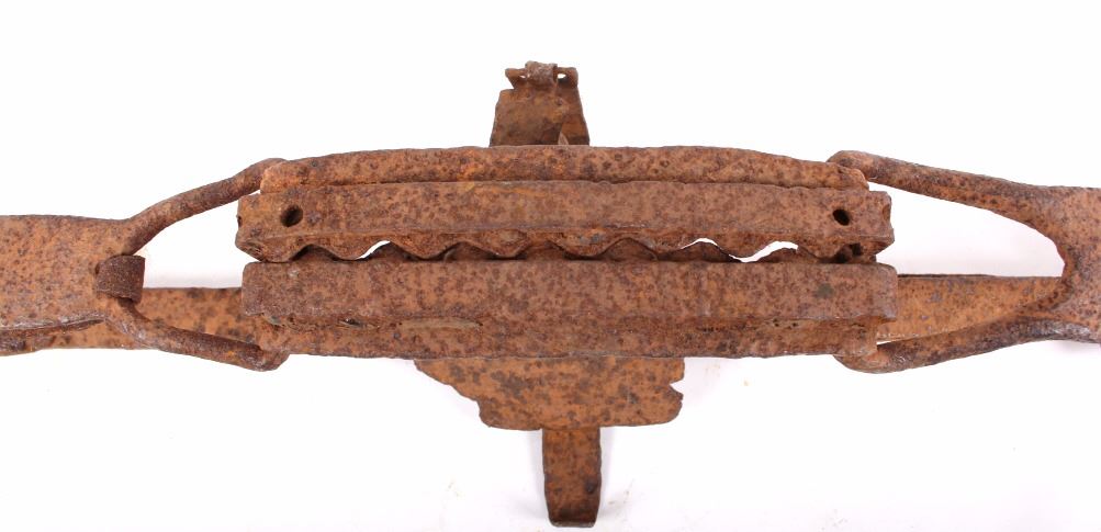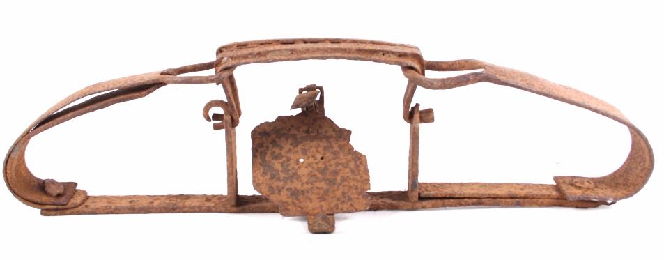 This lot features a early hand forged fur trade bear trap. The trap was forged during the 19th century. The trap features a large square pan and large springs. This is rare early piece. Makes a great collectors item. The piece is in good condition for its age. Measures: 30" W x 8" D x 8" H
