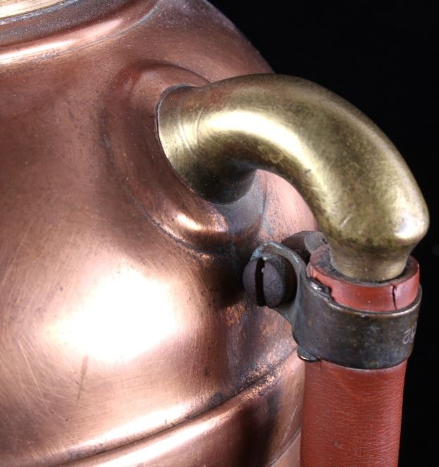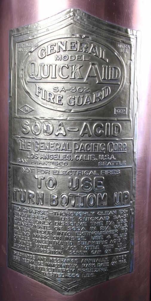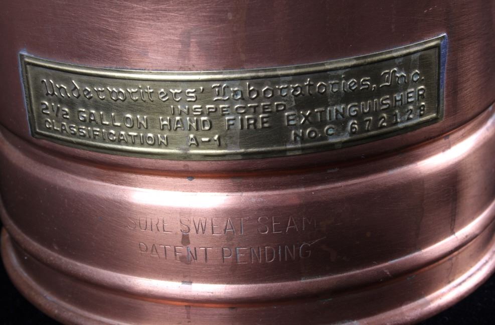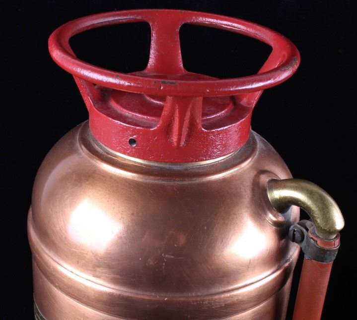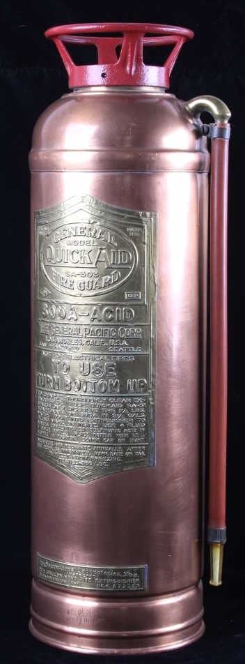 This lot has a pre 1942 General Model quick aid Sa-303 fireguard fire extinguisher. This 2.5 gallon fire extinguisher measures approximately 24" tall and 7" in diameter. Body is made of copper with brass face plates, fittings, and top. This extinguisher was produced prior to 1942, before the company changed its name to General Detroit. This vintage extinguisher is a great collector and display piece. The piece shows good condition.