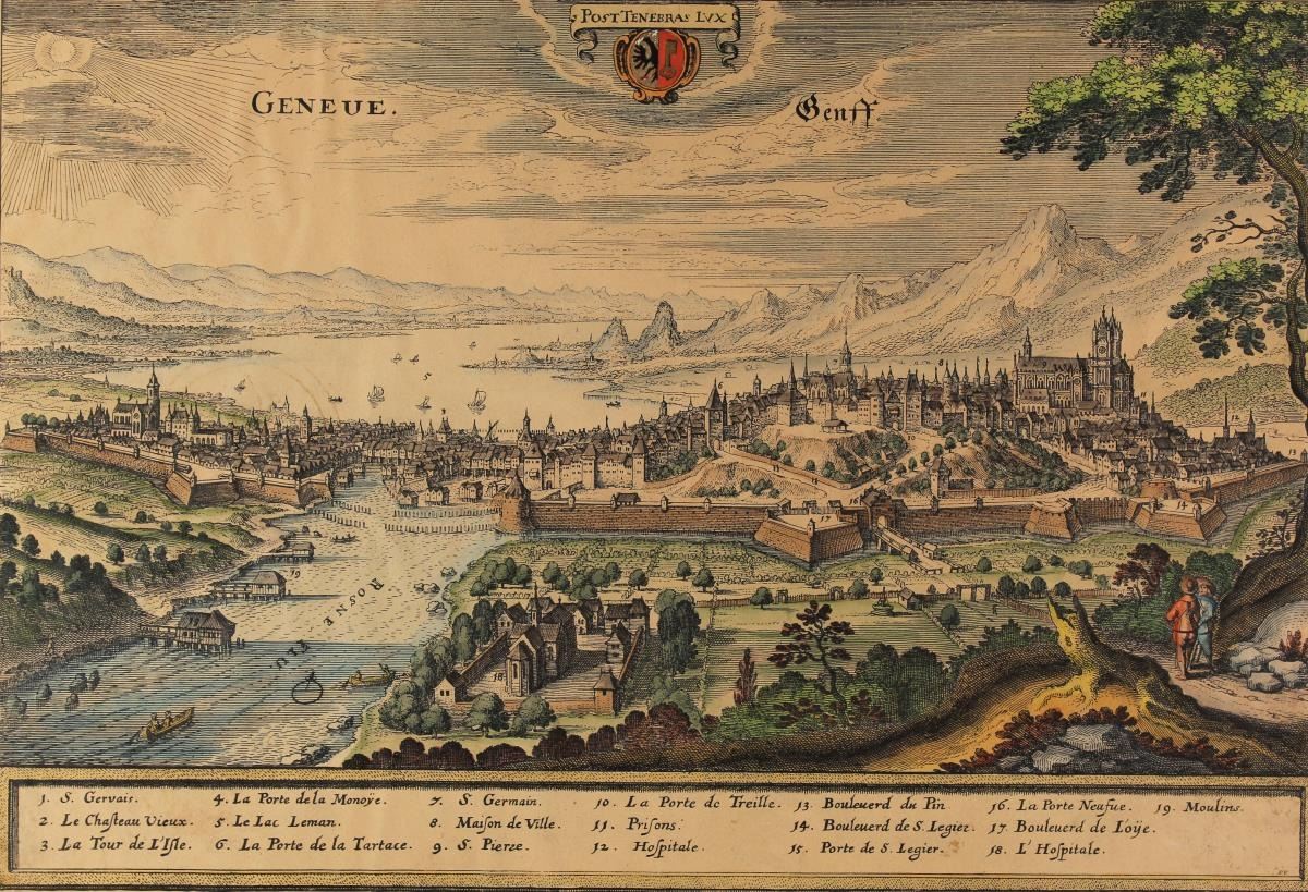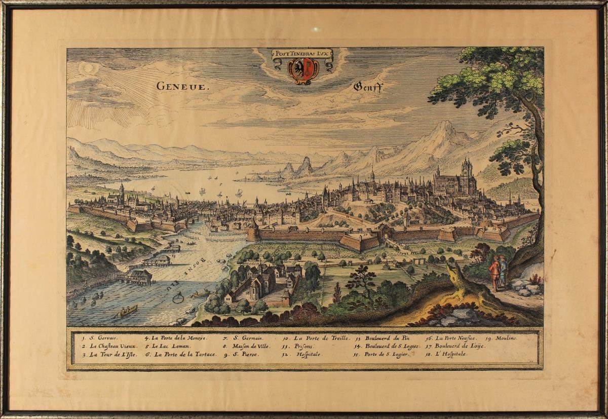 Hand-colored geographical engraving of Geneva, framed under glass.