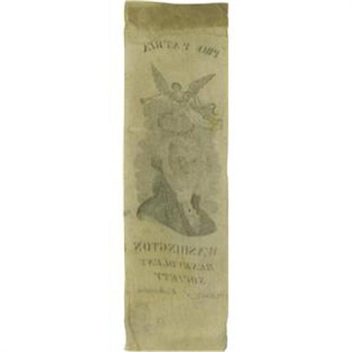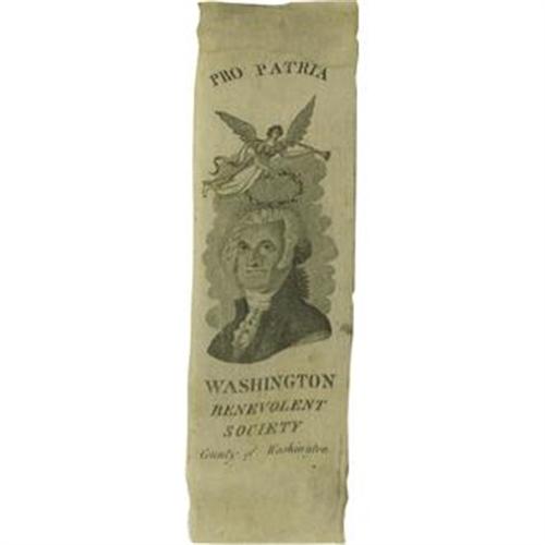 <B>Early George Washington Silk Ribbon.</B></I> Issued by the "County of Washington" (Western Pennsylvania?), it probably dates from the 1808-1815 era. "Benevolent Society" was a contemporary term for what today we call an insurance company. The small size and style of the engraving suggest an early date. Minor light overall "aging" noted for accuracy, but very good shape overall. 1.75" x 5.75".