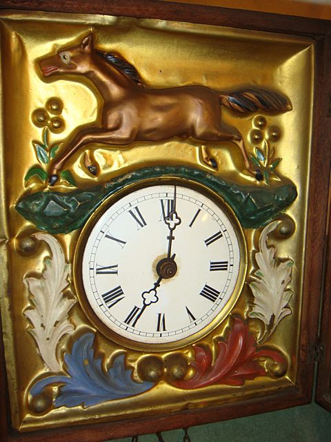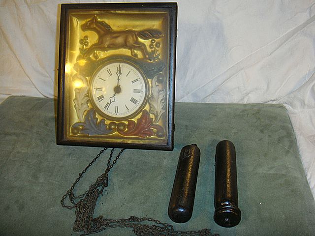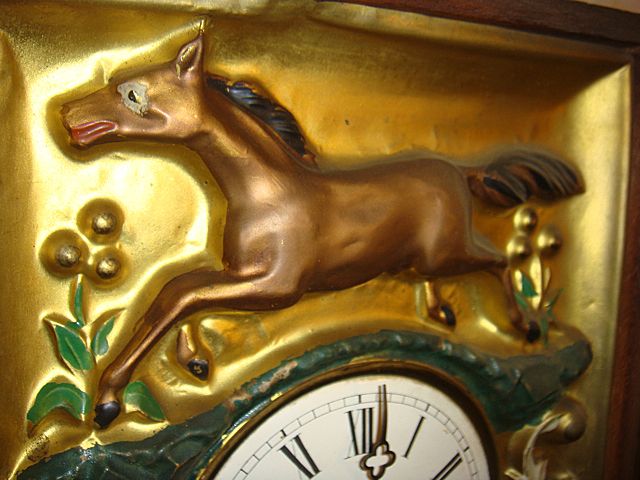 Early German Picture Frame Clock with the brass embossed face with horse. Has 2 original weights, all in original condition, never saw one before that had a horse on it. Very unique picture frame clock! Wonderful item for an horse enthusiast!