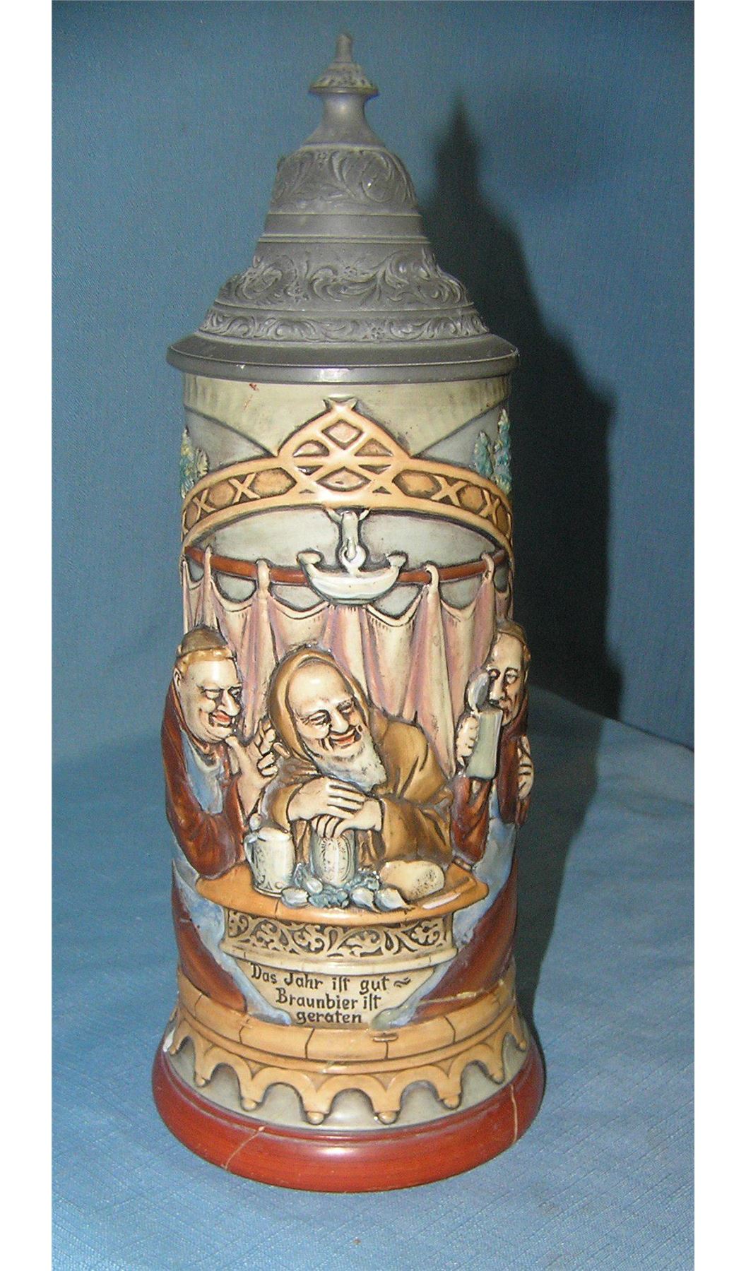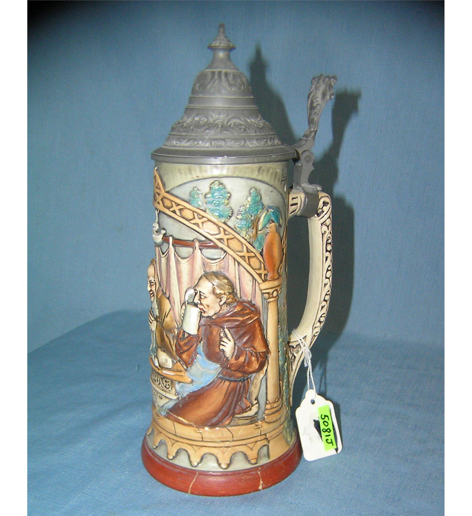 Early German beer stein with pewter lid features a group of 3 festive gentleman condition as found with many repaired cracks est. value $200.00-$250.00