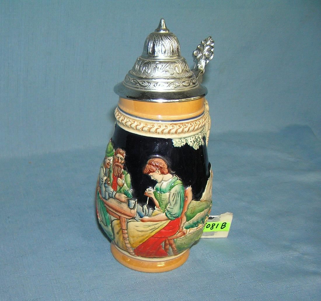 Vintage German beer stein features a festive group of 3 on front of stein est. value $125.00-$150.00