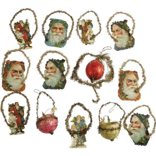<B>Early Glass and Paper Christmas Ornaments</B></I> decorated with foiled garland. The three glass ornaments are in fine condition with some minor paint loss and silvering showing through. Also included in this lot are nine diecut Santas in excellent condition.<BR><BR><b>Shipping:</b> Hollowware/Pottery/Glass, Small (<a target="_blank" href="http://www.heritageauctions.com/common/shipping.php">view shipping information</a>)