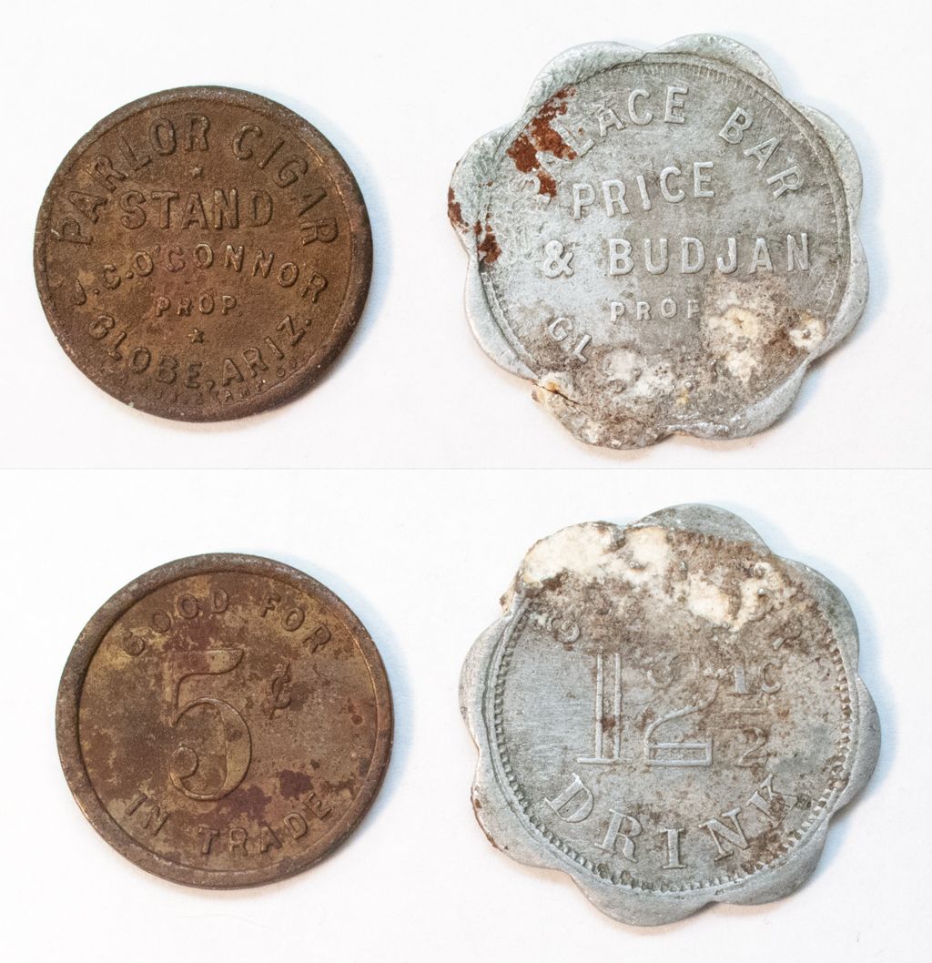 (2) PALACE BAR // 12½¢ DRINK Scalloped (8) Aluminum, PARLOR CIGAR STORE // 5¢ BrassCity: GlobeCounty: GilaState: AZDate: