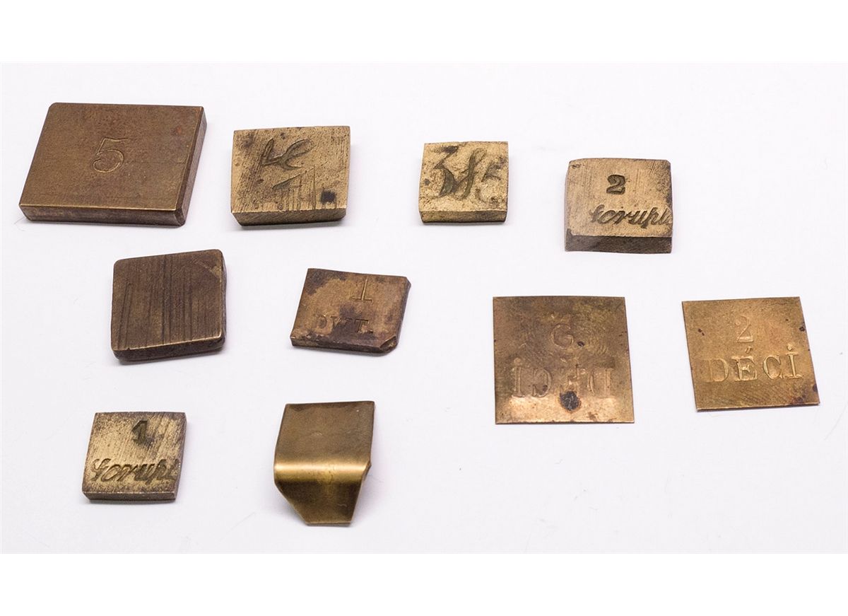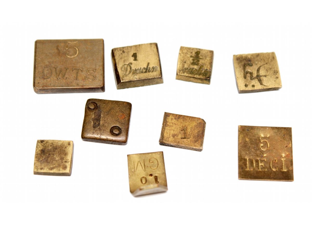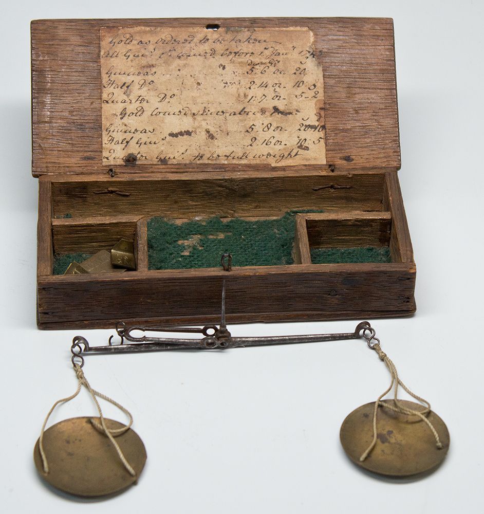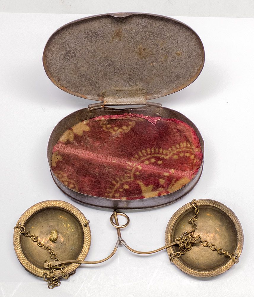 1743 This very early 5.5" x 2.5" x 1" wooden gold scale box is fastened with simple wire loops and is lined in green cloth. The three compartments in the box contain the balance with two cups and 11 weights of different sizes. The top of the case bears a scalloped design. The underside of the lid bears an early handwritten label which describes appropriate weights of gold for different denominations (half dollar, quarter dollar, etc.) and notes the date Jan. 1743. This gold scale may have been used as an assay scale during the early North Carolina or Georgia gold rushes. A fantastic early piece. This simple oval tin, 3.25" x 2.25" x 0.75", us unmarked and bears no labels, but contains a balance with finely decorated pans. The interior is lined on the bottom with red and gold patterned velvet. A small golden nugget is included. - HKA#64327