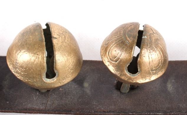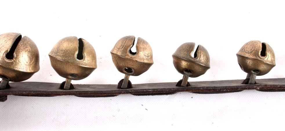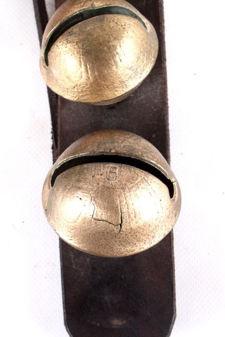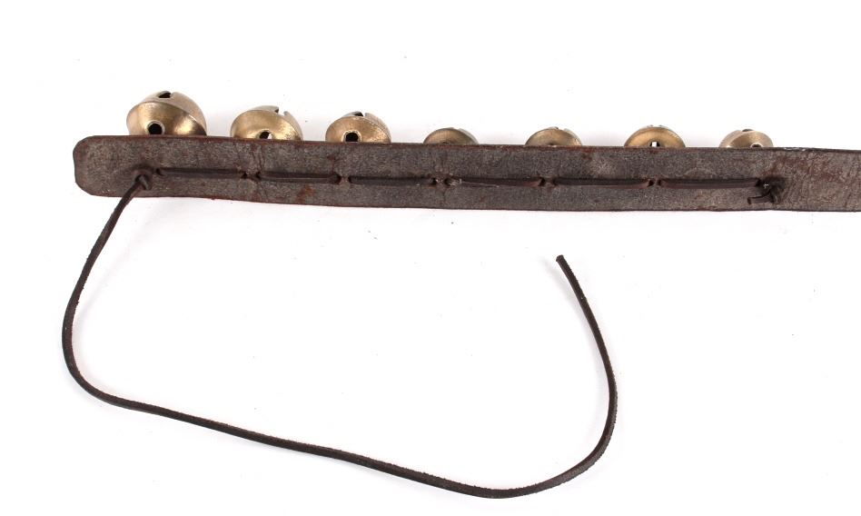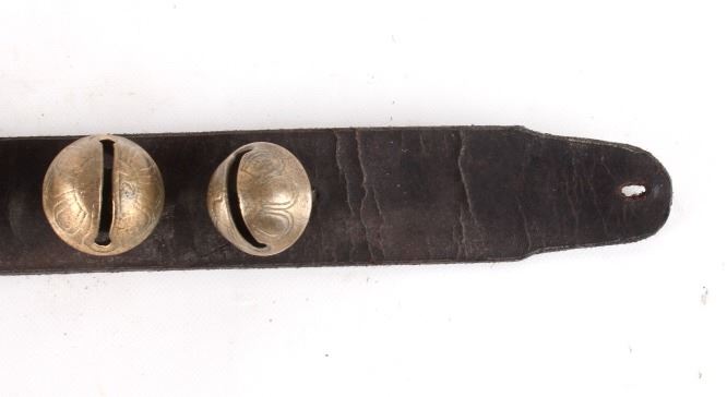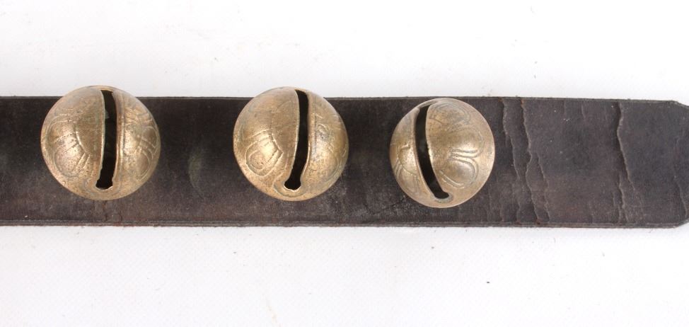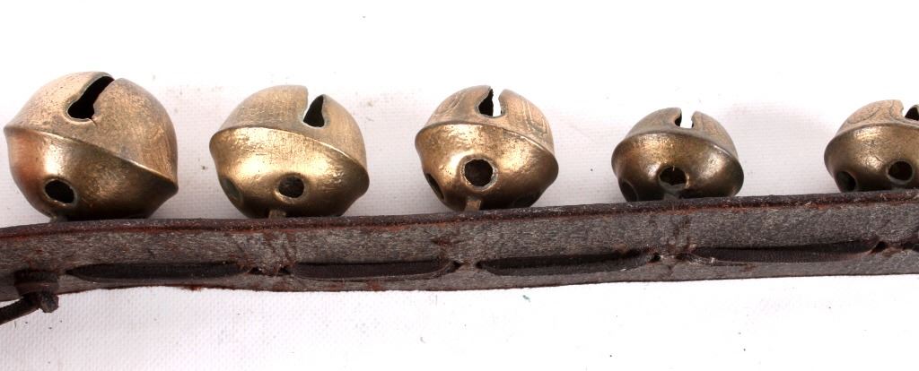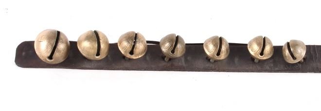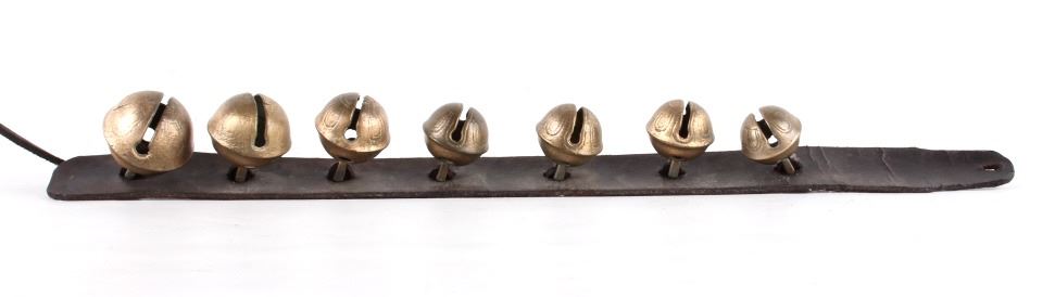 Featured in this lot are seven large brass sleigh bells, mounted firmly to a thick leather collar (which includes a tie). The bells have an excellent, deep, rich tone and are primed for use at your future holiday festivities. The largest bell is marked "5" and measures 1.5" in diameter. The collar measures 16.5" long and it and bells are in good condition.