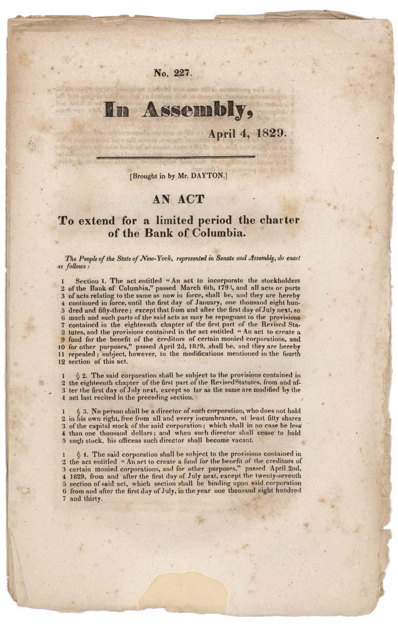 1829, New York. 8 1/2” X 13 1/2”. Early 7 piece group of printed acts to extend bank charters in New York state in 1829. The acts are for the following banks; Bank of Columbia, Bank of Utica, Bank of Auburn, Bank of Newburgh, Middle District Bank, Bank of Genesee and Butchers and Drovers’ Bank, Nice early banking related memorabilia.