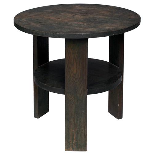 Early Gustav Stickley table, attribution, thick circular top over a lower shelf supported by three slab legs, original green finish, uncatalogued, but similar in design and construction to other early forms by Gustav Stickley, 30"dia. X 28"h, very good co