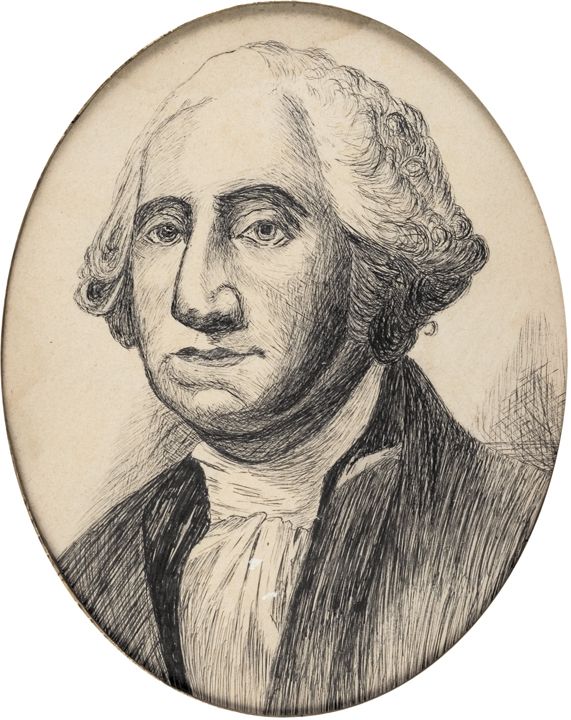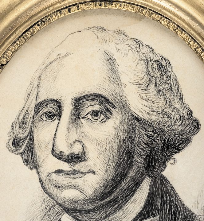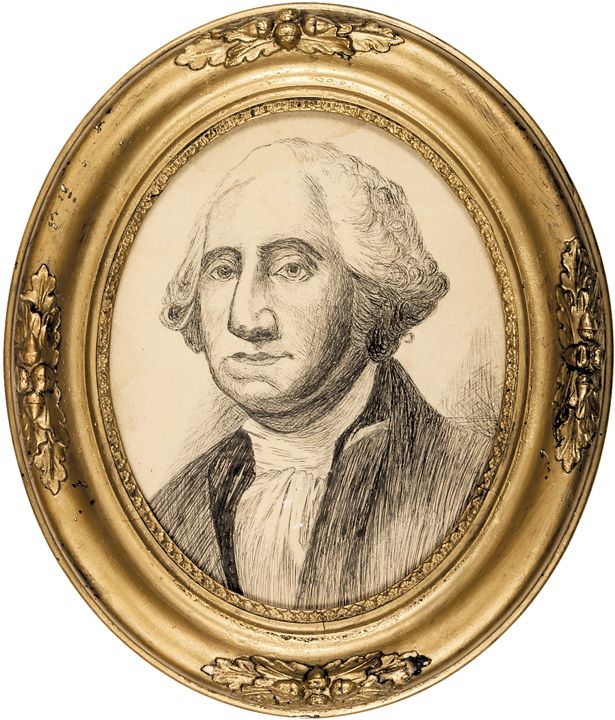 This is an original, early 19th century, Pen and Ink Drawing of George Washington, not signed or having any markings upon it. It appears to be housed in its original 19th century ornate gold painted frame from that era. The frame measures 13.5" x 11.5" while the drawing itself is 10” x 7.5" (sight seen) in an oval design. The drawing is in deep black ink on a heavy period paper. The condition of the picture is actually very good, and it does have a mild humidity tone at the top and side, with two tiny faint white spots on the shirt. The period decorative frame has some expected trivial scattered nicks to the plaster and an old repainting. In any event, this early Pen and Ink Folk Art style rendition of George Washington’s portrait is well done and quite attractive as such, being ready for display.