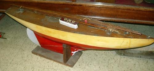 Early Handmade Red & White Sailboat with 3 masts and working rudder, on stand, measures 36" l, 9 1/2" high
