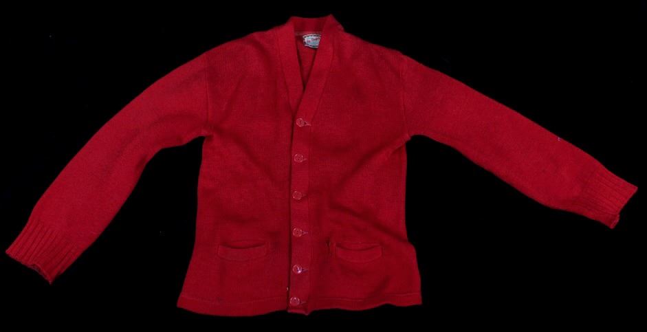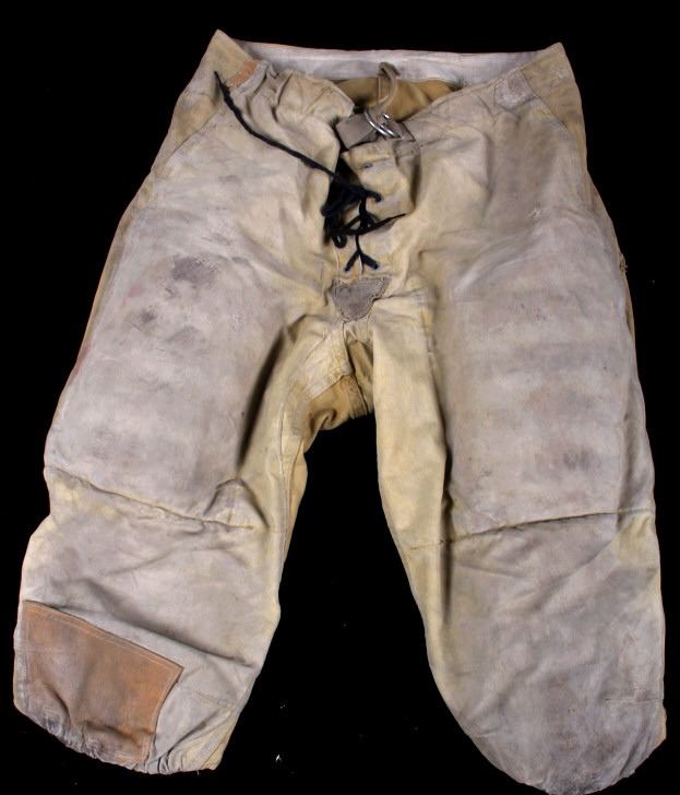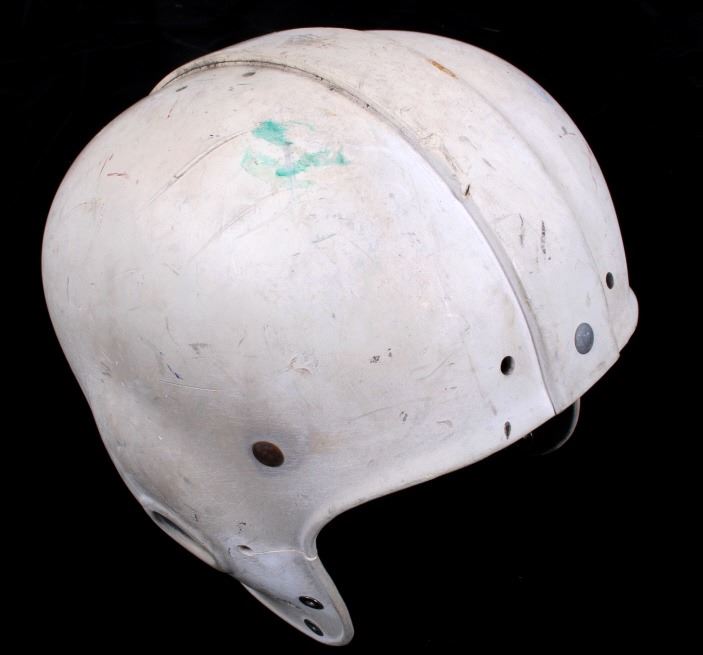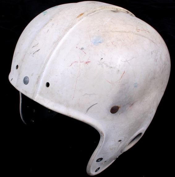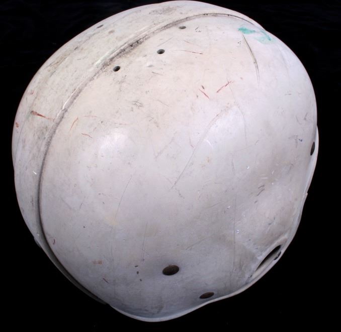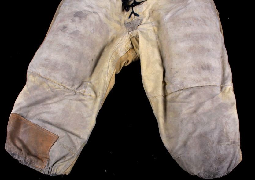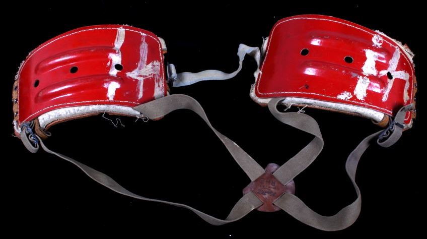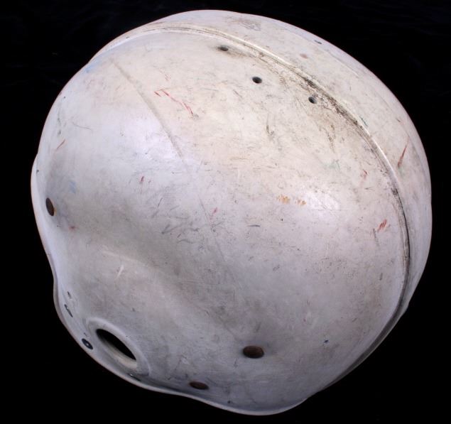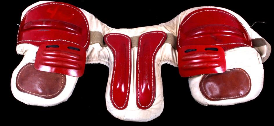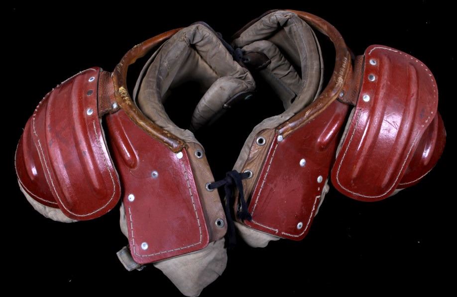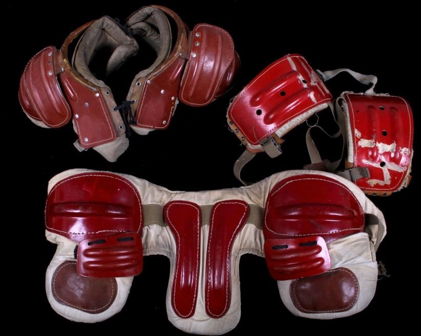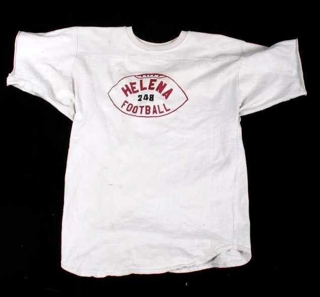 This lot features a early Helena, Montana football uniform and pads from the 1950's. This is a well preserved piece of Montana sporting history, showing a near complete uniform. This look to be a high school uniform, with the front of the shirt having "Helena Football 248" printed on it. This lot includes a helmet, red sweater, padded pants, shoulder pads and jersey, and other pads. They are all in good condition for their age, showing signs of use.