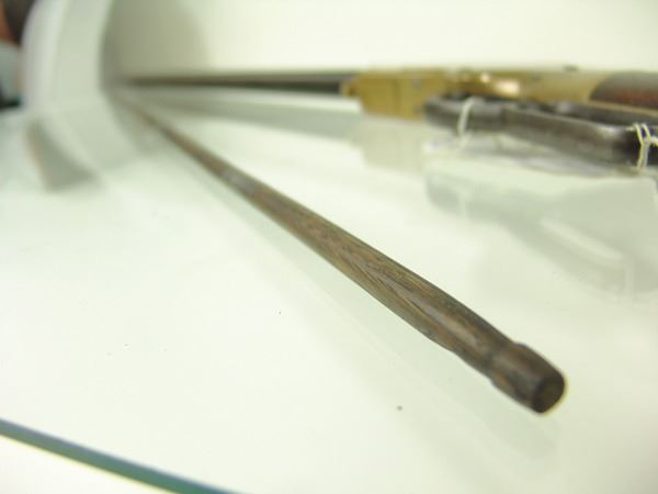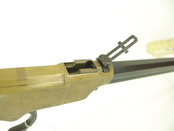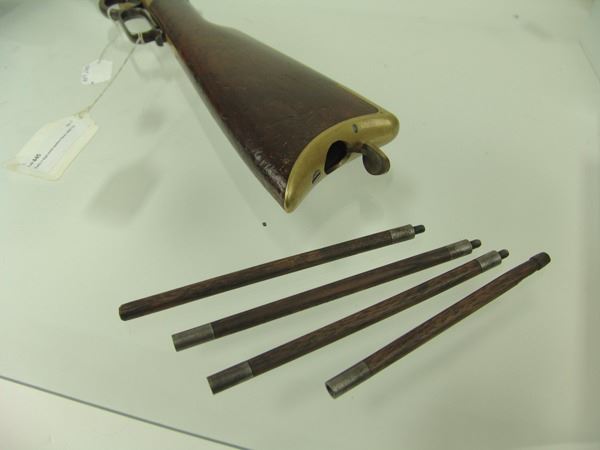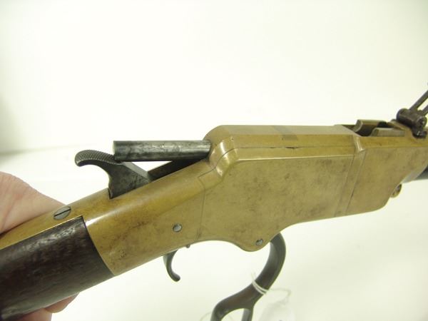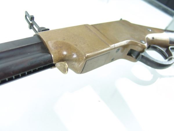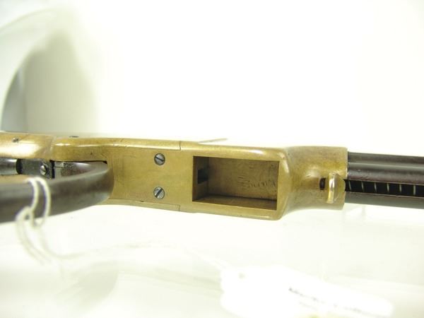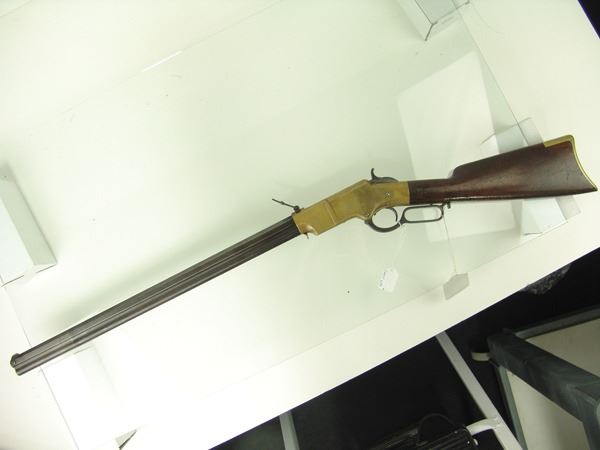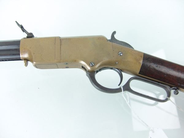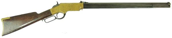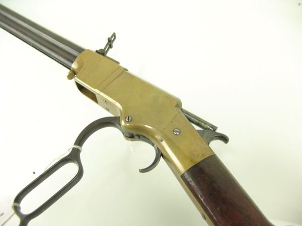 Rare, early 3-digit (#431), .41 cal. "First Henry", lever action rifle with lever latch, rear sporting sight, and original cleaning rod in stock. Very good condition. Stock in great shape, iron has great patina. Very rare. S/N 431.