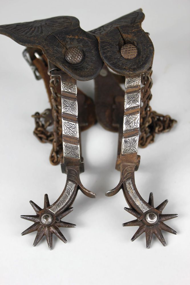 Nearly mint pair of early unmarked California style spurs, attributed to Hernandez. Single mounted with deeply engraved silver inlaid stripes, deeply chased off sides, inlaid drop shanks, and fabulous feathered rowels. With original tooled straps.