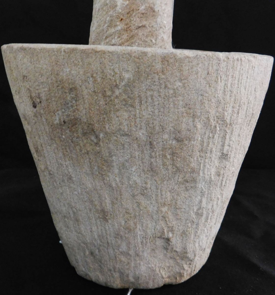 Early Historic Mortar & Pestle, circa 1600-1700s. This heavy M&P is made of sandstone, mortar measures 6" x 6" and pestle measures 6" x 2.5". From central Mexico. Possibly of Spanish origin. Condition: Pestle appears to have been broken, see images. Shipping: $24.
