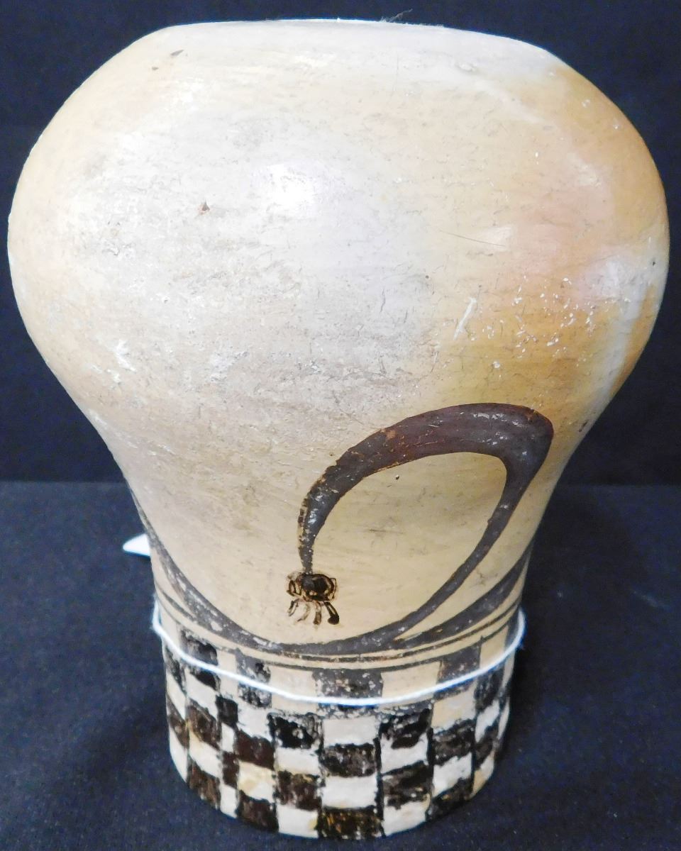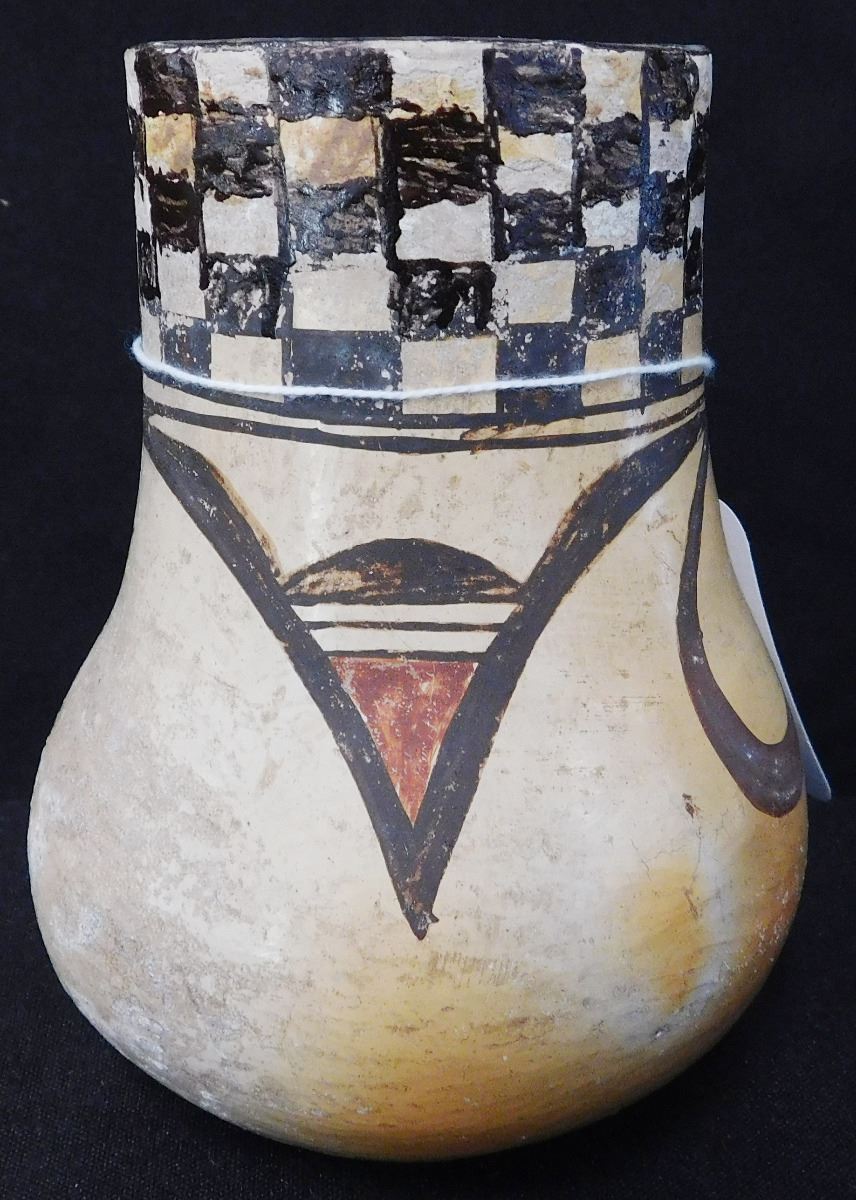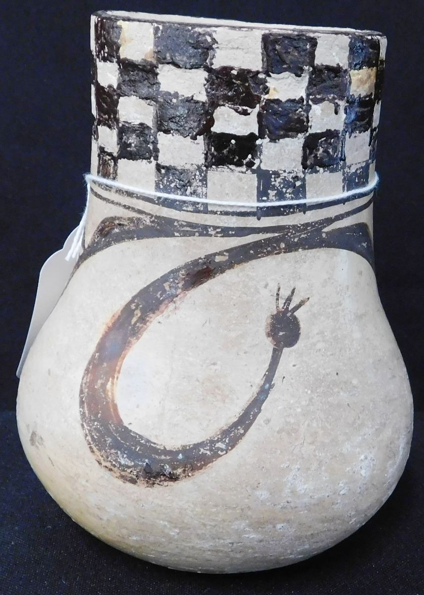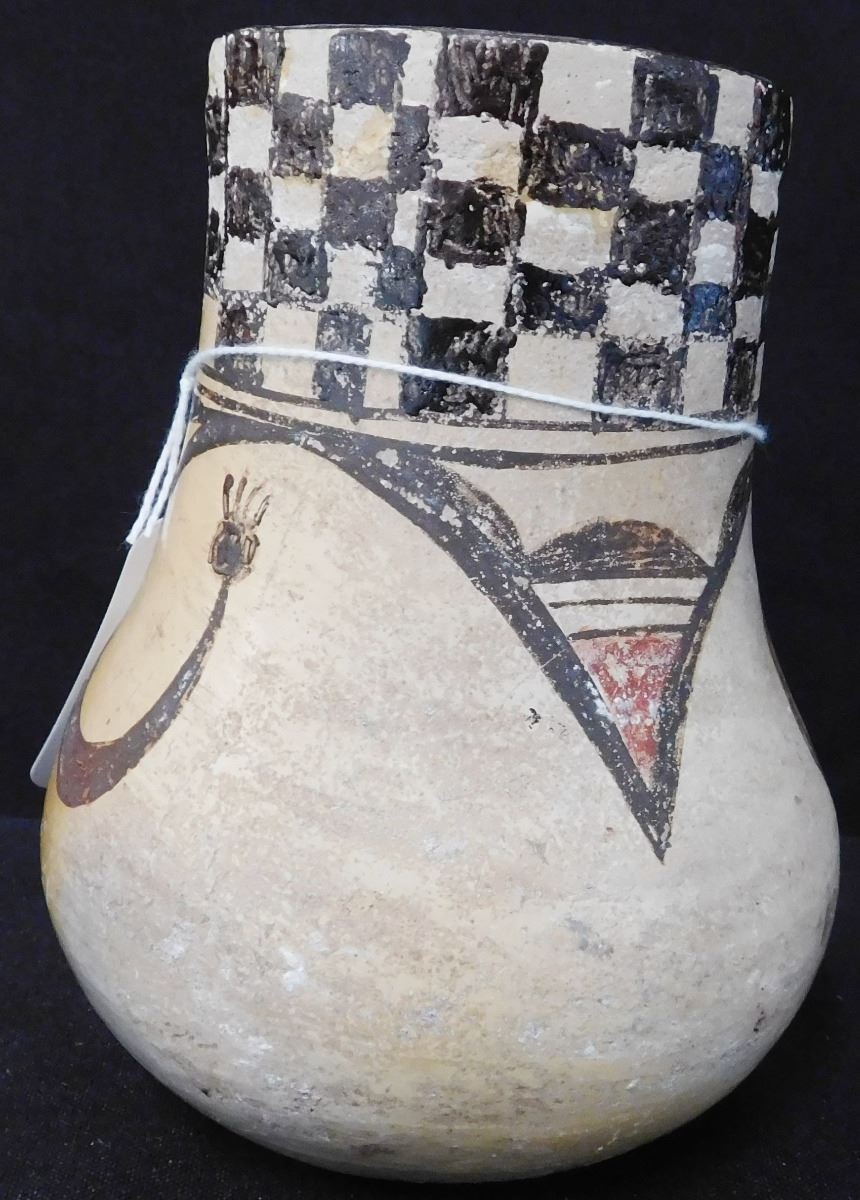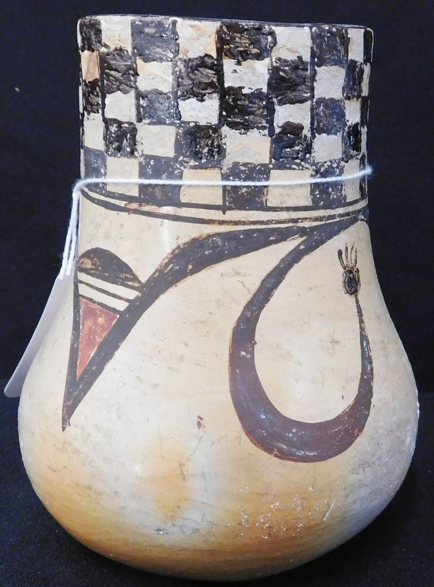 Early Hopi Pottery Olla, circa 1800s. Made of clay and paint, the item measures 5.5" x 4". Hopi, Northern-central Arizona, USA. Condition: There is minor repaint on the top, see images. Shipping: $24.00