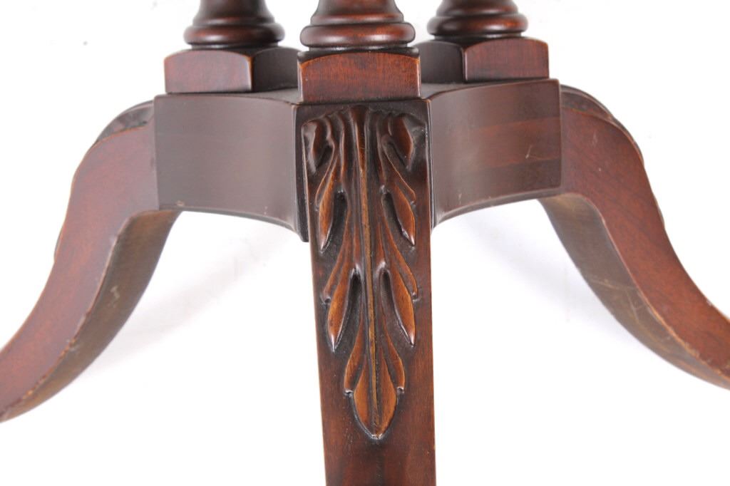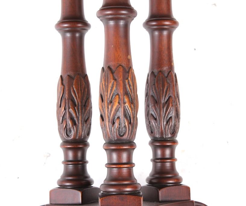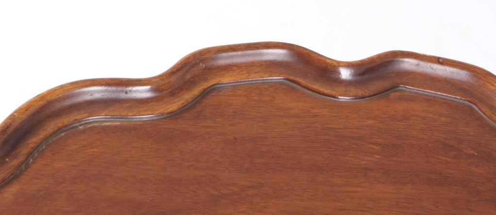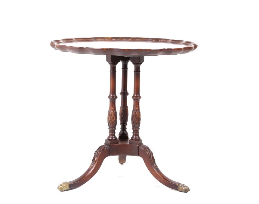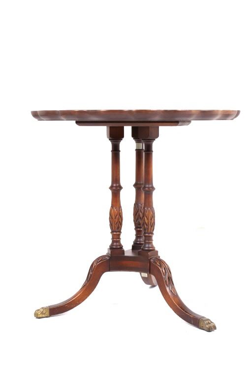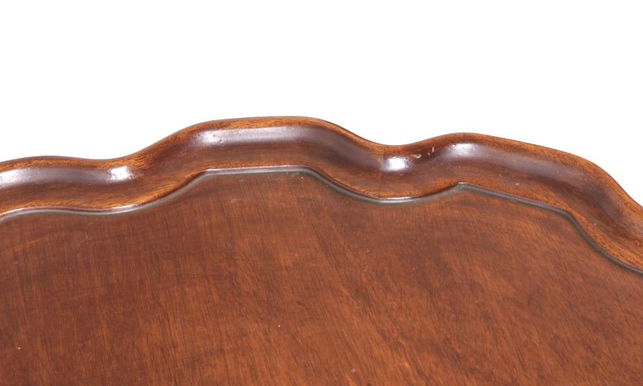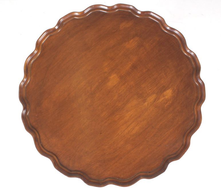 Offered for your bidding pleasure is this early Imperial Mahogany Pie Crust Wine Table. Imperial Furniture Co., of Grand Rapids, Michigan, was founded by F. Stuart Foote in 1903. This wine table shows a gorgeous, sturdy Mahogany construction. This table features a three leg pedestal with a carved floral detail on each leg as well as brass claw feet. The table top displays a unique pie crust top showing a raised, scalloped edge. This piece shows excellent condition and craftsmanship. It measures 27 1/2" in height, and the table top 28" in diameter.