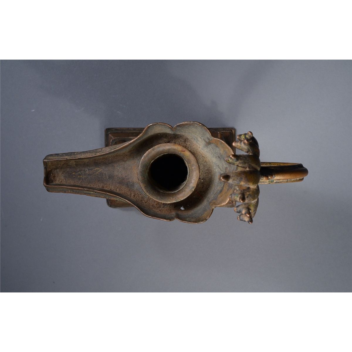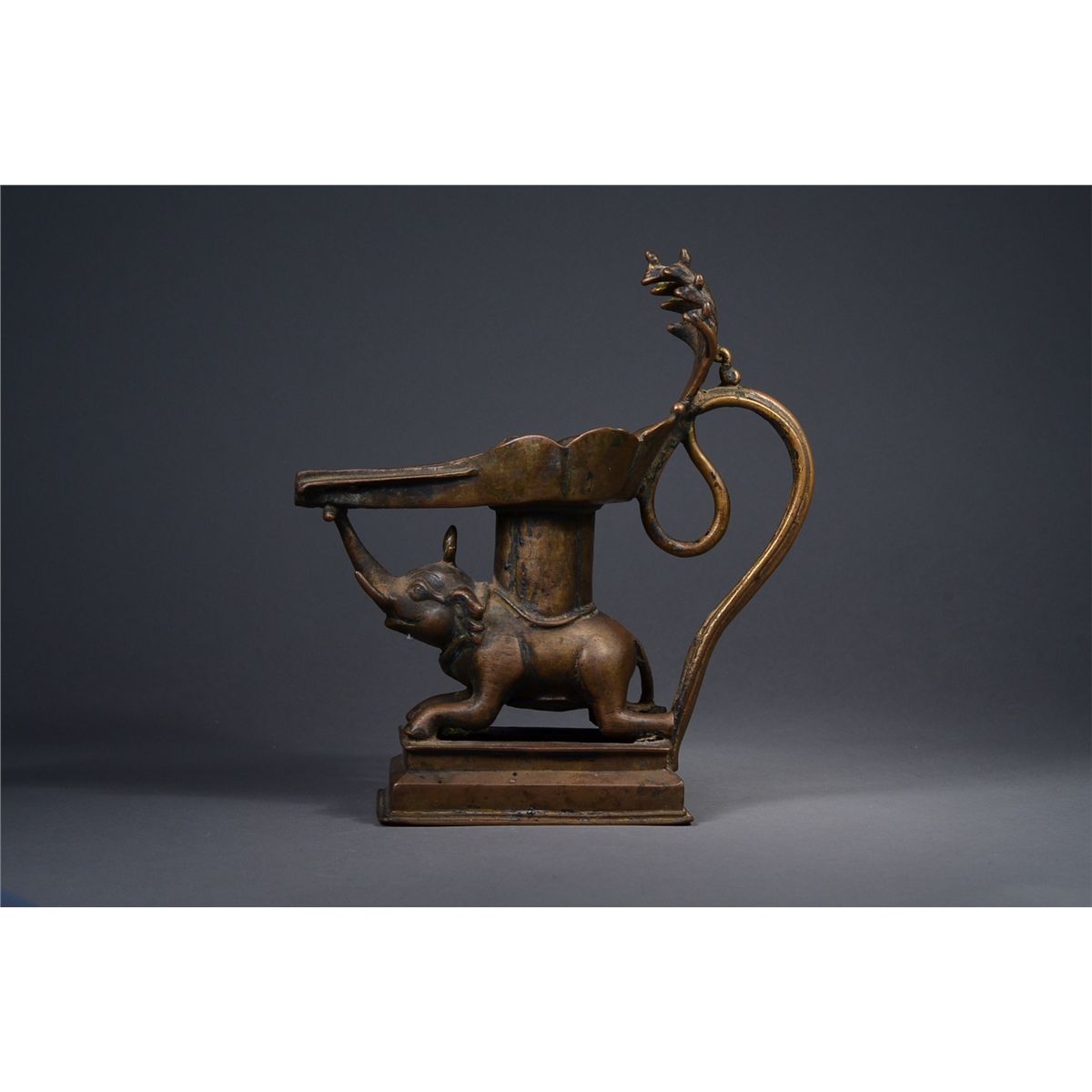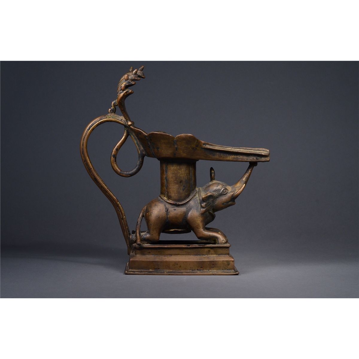 Early Indian bronze candle holder; in form of elephant; the shallow dish in form of petal lappets; H: 20 cm, L: 20 cm, W: 7 cm; Toronto Estate Collection